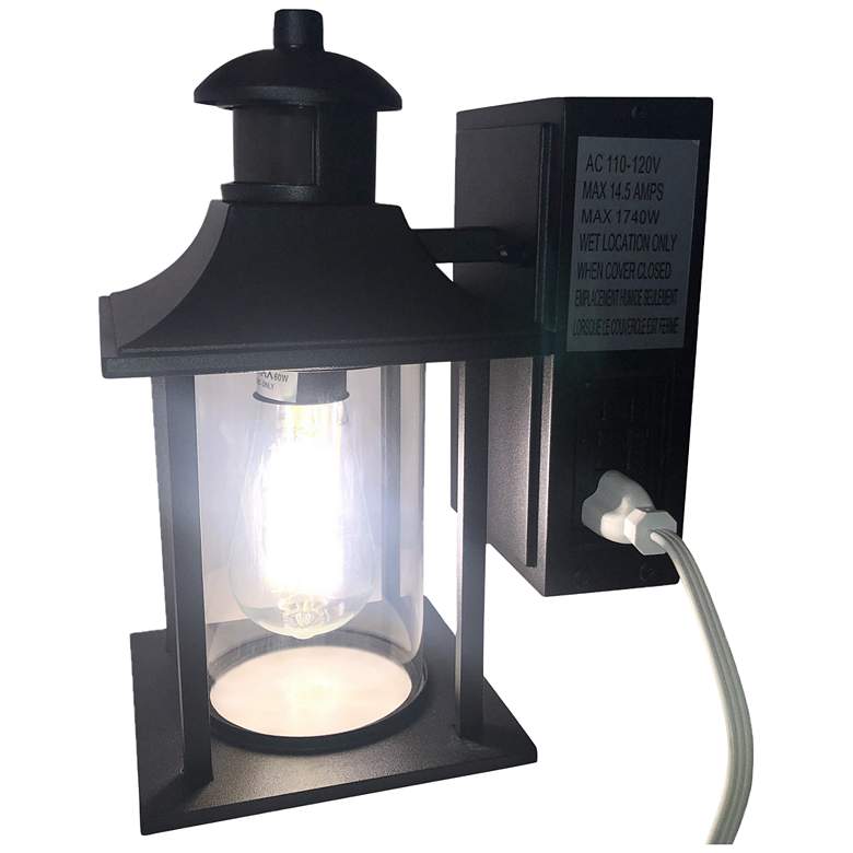 Embrace the complex versatility of the Brennan outdoor wall light from Amax Lighting and enhance your home's curb appeal. This matte black finish piece features a combination dusk-to-dawn and motion sensor, activating once the sun goes down and turning to full brightness when motion is detected. A single LED bulb is housed within the clear glass shade, providing illumination. The Brennan collection is wet location rated for outdoor use, and includes an AC 120v outlet for additional power cords.