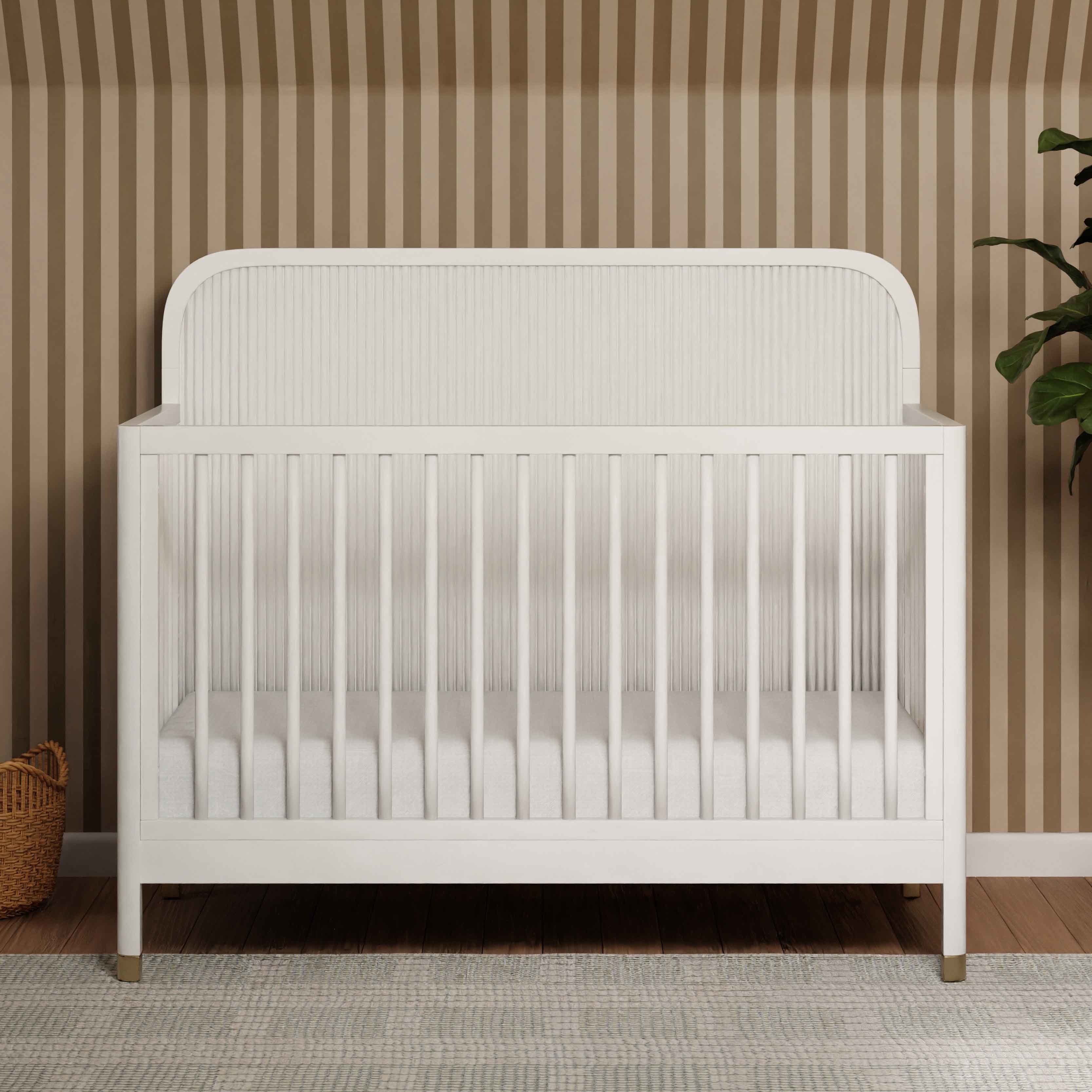 The Brimsley Tambour Crib is a masterpiece of craftsmanship that blends timeless design with modern functionality. Its distinctive tambour design and gently curved slats, paired with elegant gold feet, make this crib more than just a place for your little one to rest; it's a statement piece that elevates the aesthetic of your nursery.