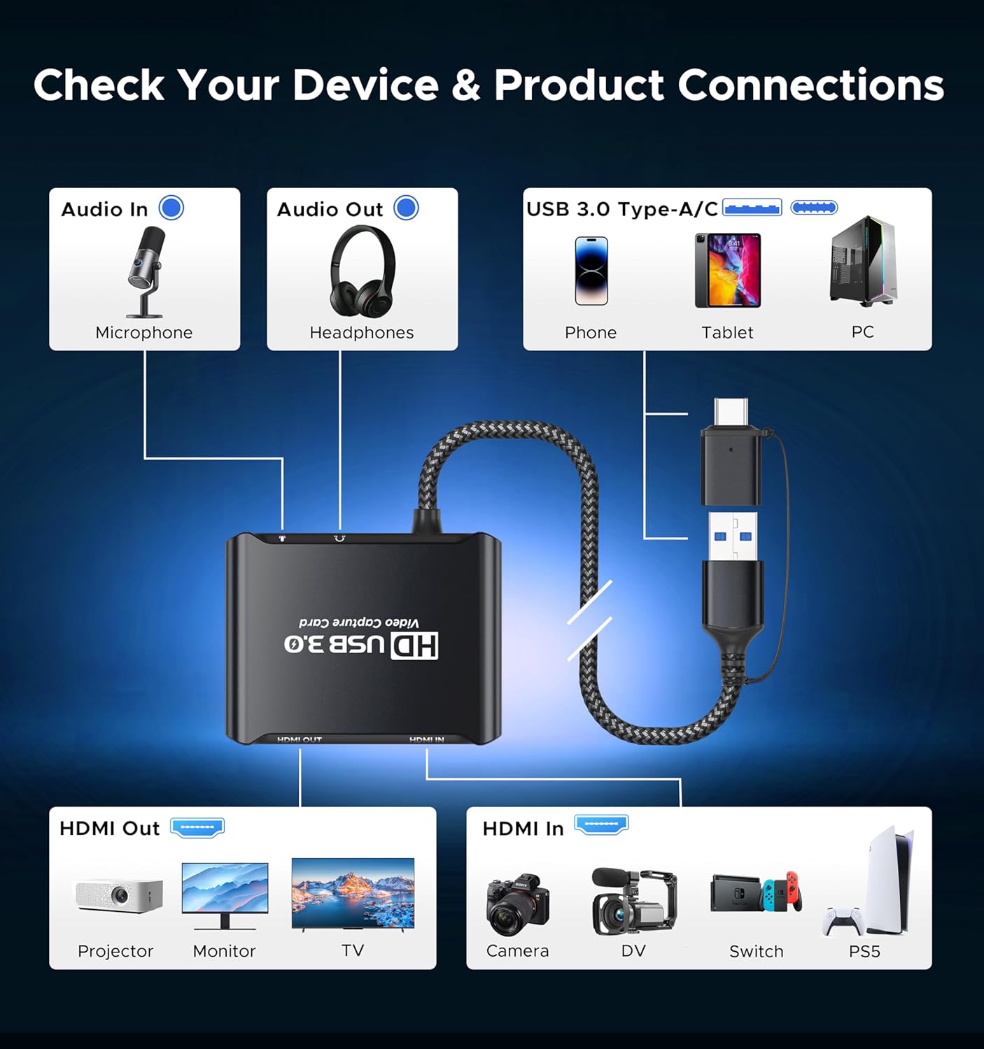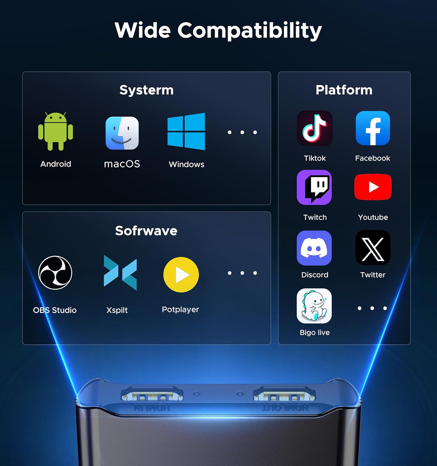 - [Wide compatibility] Compatible with both Windows and Mac OS. Super speed USB 3.0 (5Gbps) for extreme advantages in high-bandwidth applications. It ensures stable performance in live broadcasting, game capture, content creation, outdoor recording, and other scenarios — all powered by its 5Gbps bandwidth. Supports multiple software platforms, compatible with Twitch, YouTube, Facebook, Twitter, OBS, PotPlayer, XSplit, and VLC. Gaming capture card compatible with Nintendo Switch1/Switch2, PS5/PS4, Xbox, PC, Android, macOS, and more