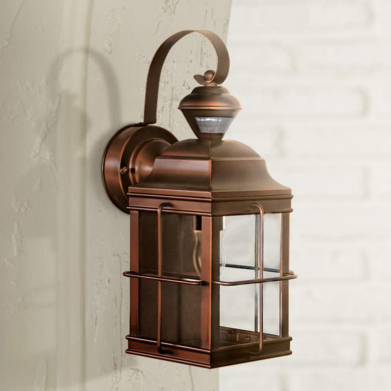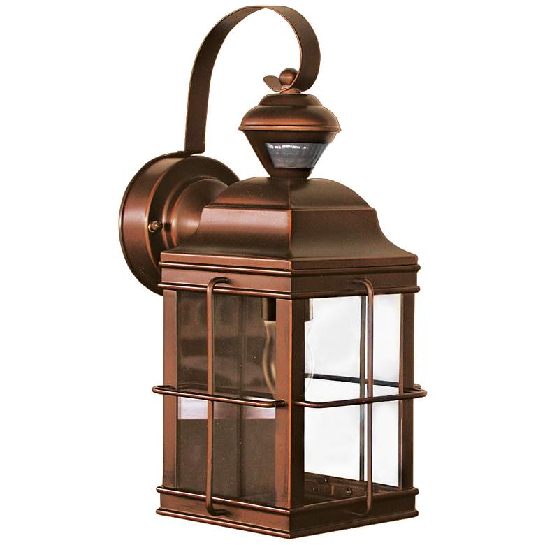 This carriage-style outside wall lamp offers great looks, plus the convenience of a built-in motion detector and dusk-to-dawn sensor. A handy security feature around garages and patios, the motion sensor has a 150-degree, 30-foot range. The design also comes with the Dual Brite two-level lighting feature, which brightens the light output from the light when motion is detected. It comes in an antique bronze finish with panels of beveled glass.