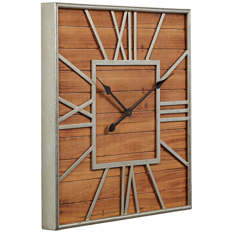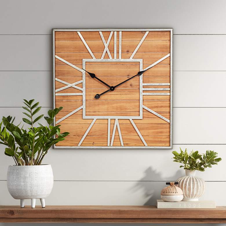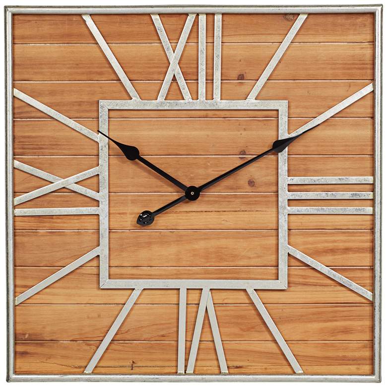 Caser Silver Metal and Brown Wood 23 1/2" Square Wall Clock