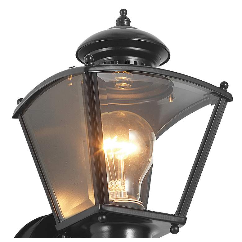 - Black finish. Brass finish accents. Steel construction. Clear glass allows bulb to be seen. Wet location outdoor rated for locations that get full exposure to rain and weather.