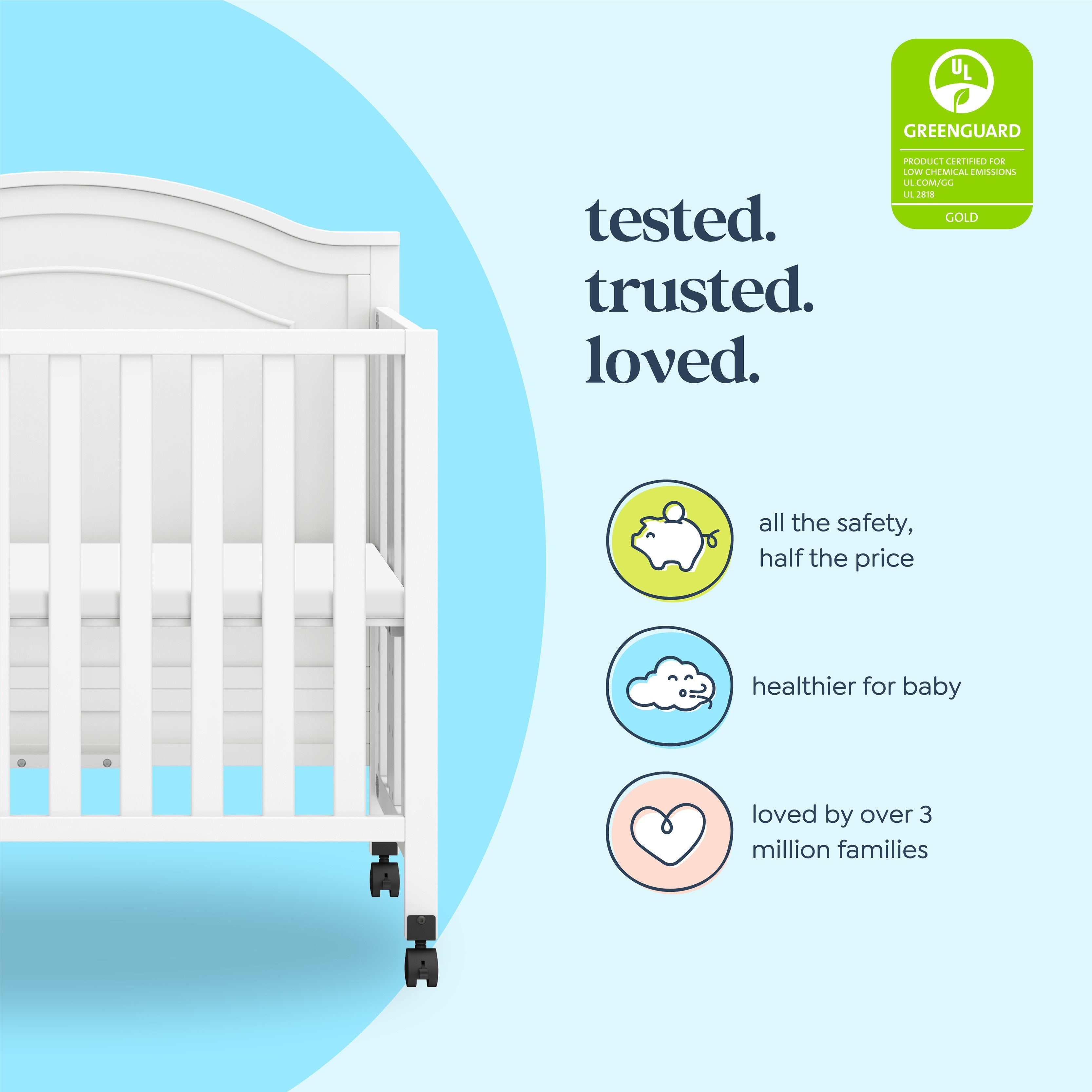 The best-selling Charlie Crib is now available as a mini crib, that is foldable and portable! The Charlie 3-in-1 Mini Folding Portable Crib is the perfect fit for small space and can be easily folded and stored away when not in use. This mini crib comes with optional rolling wheels that allow you to move the crib freely throughout your home. It is both durable and lightweight and converts to a twin bed to grow with your baby beyond the nursery years.