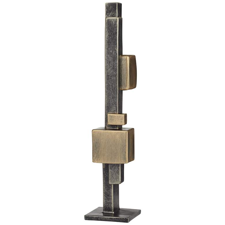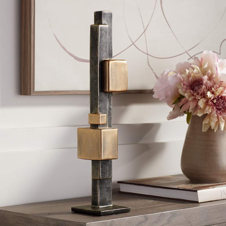 Augment decor in your den or living room with this modern abstract decorative sculpture. It features a vertical silhouette of stacked geometric objects. A two-tone finish in metallic gray and matte antique brass to create compelling texture and depth. The sculpture if made from resin and is perfect to add verticality to a table or shelf display.