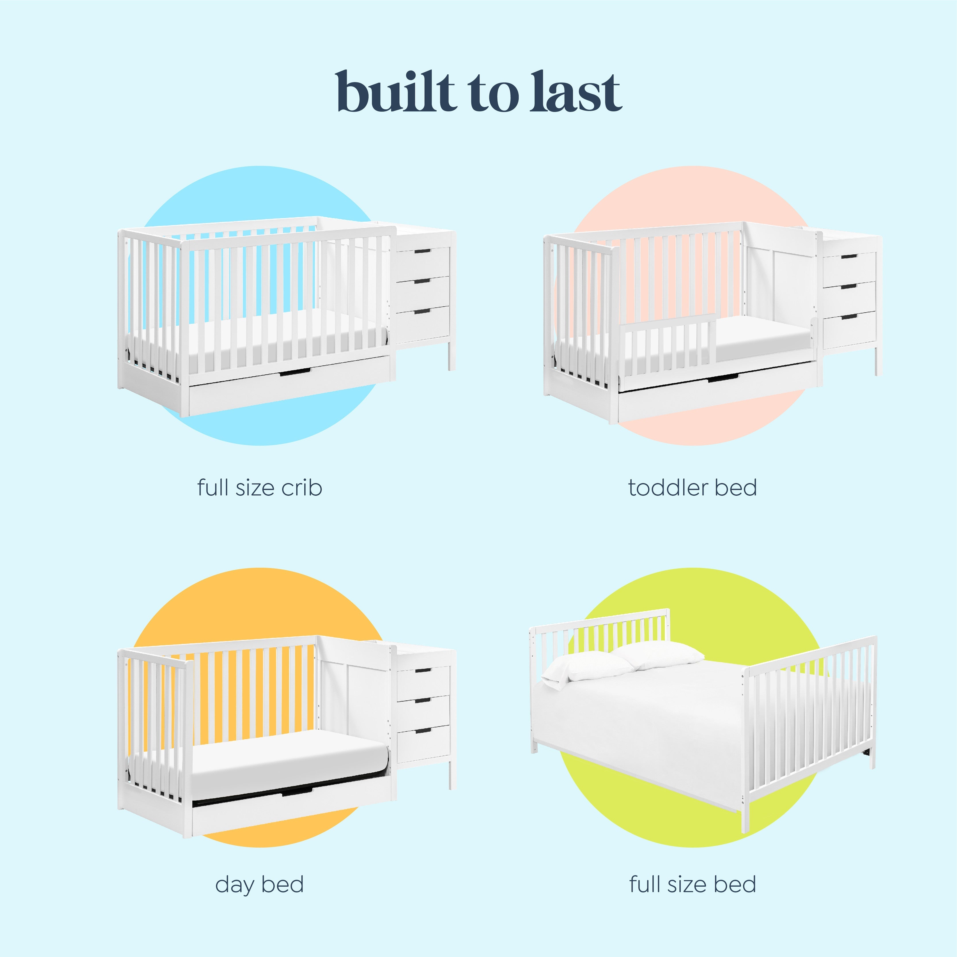 The Carter’s Colby Crib & Changer Combo is now available in a versatile crib and changer combo that provides everything you need for baby in one convenient package. The Colby 4-in-1 Convertible Crib & Changer Combo combines clean lines, outstanding quality and multi-functional design. During the infant years, the changer with included changing pad, provides an extra deep surface for diaper changes with spacious drawers and multiple storage shelves to hold all of baby's necessities. Beyond the nursery years, this crib converts to a toddler bed, day bed, and full-size bed for use long past the nursery years. Coordinates with the Carter’s Colby 3-Drawer and 6-Drawer Dressers.