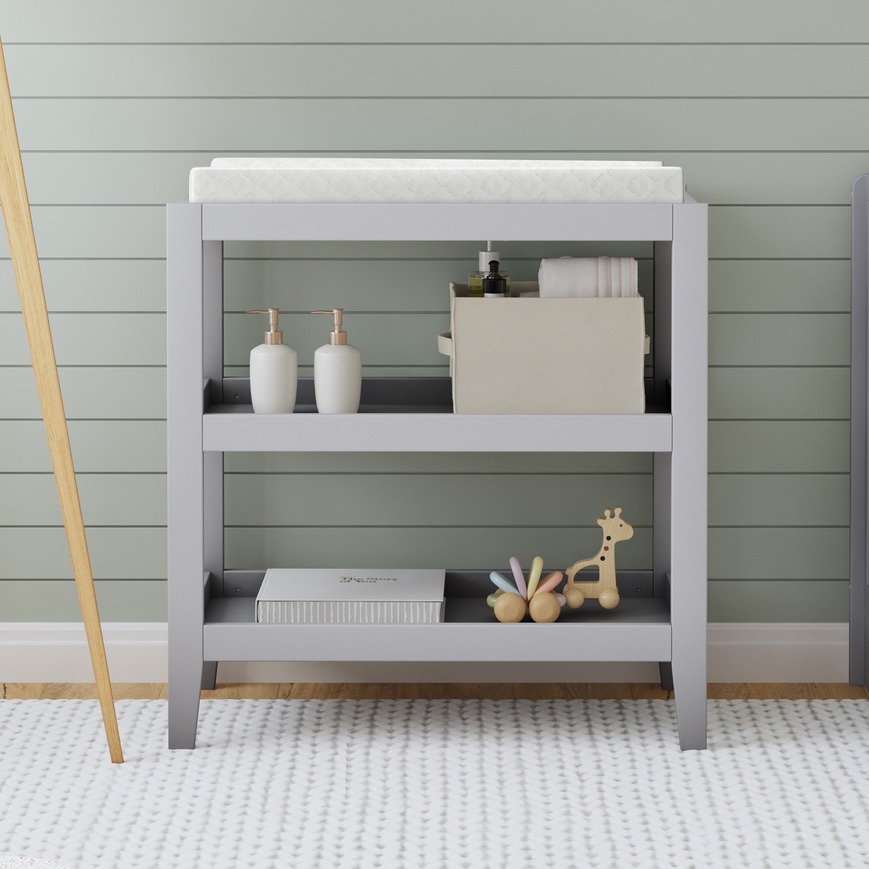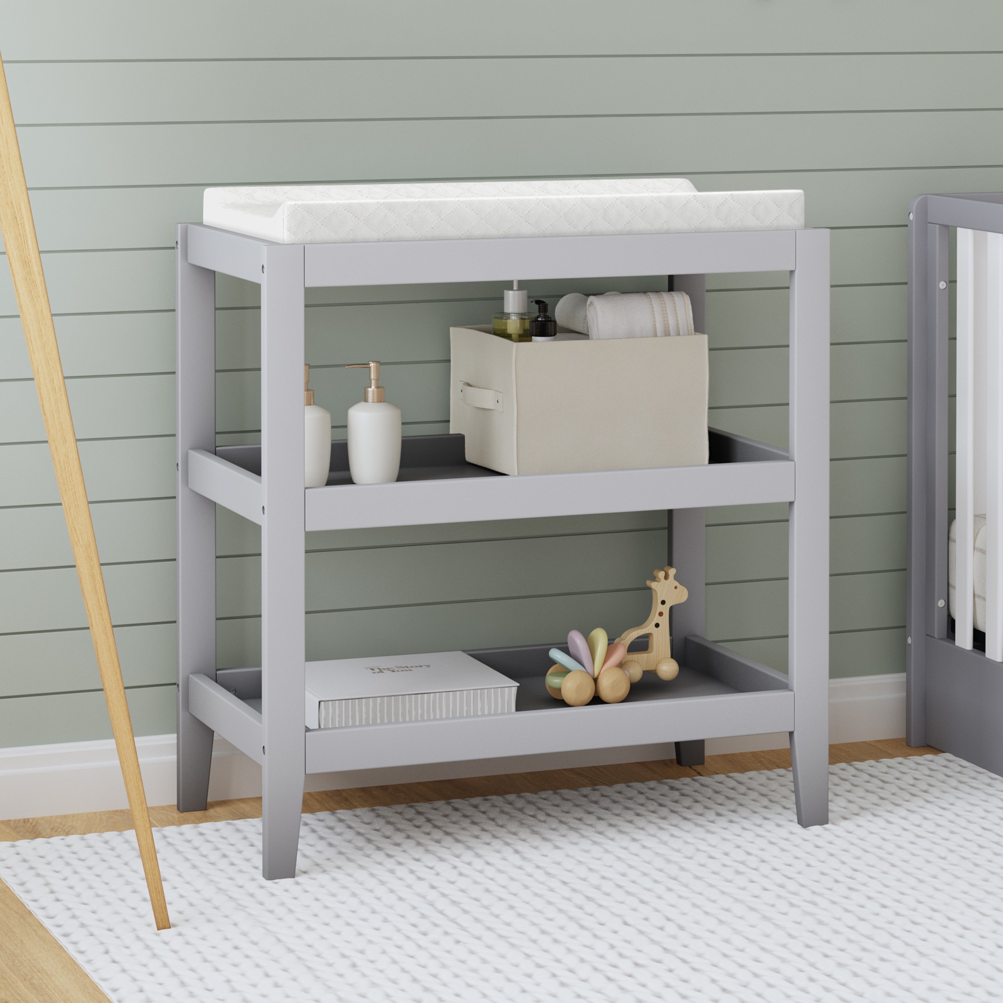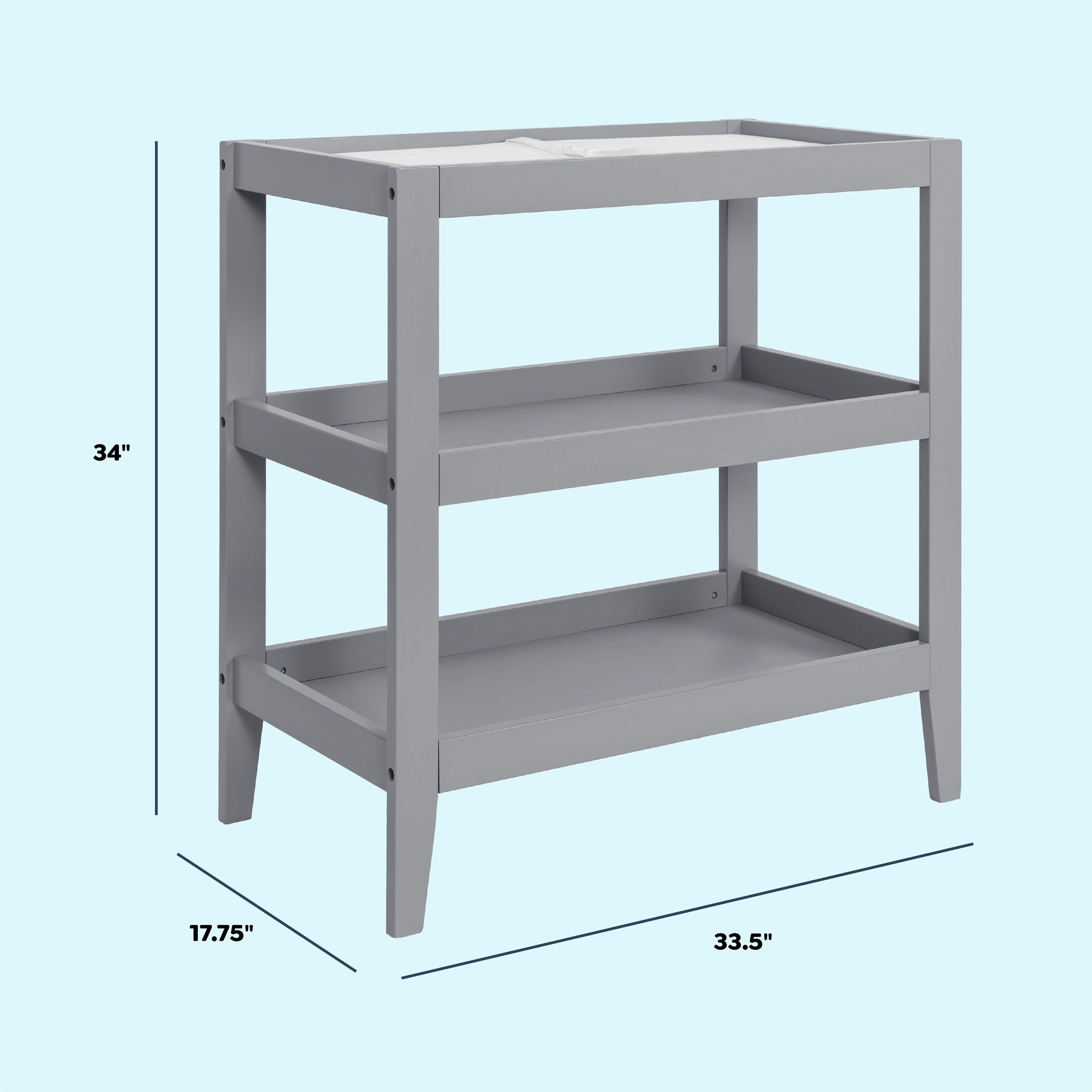 The Carter's Colby Changing Table features a universal design with clean lines that will suit any style of nursery decor. Crafted from non-toxic materials, its solid construction ensures baby can rest safely and comfortably during changings. The Colby Changing Table's versatile design includes a built-in tray top to fit a changing pad and two spacious shelves providing storage for all of baby's necessities. Coordinates with the Carter's Colby Crib, Colby 3-Drawer Dresser and Colby 6-Drawer Double Dresser