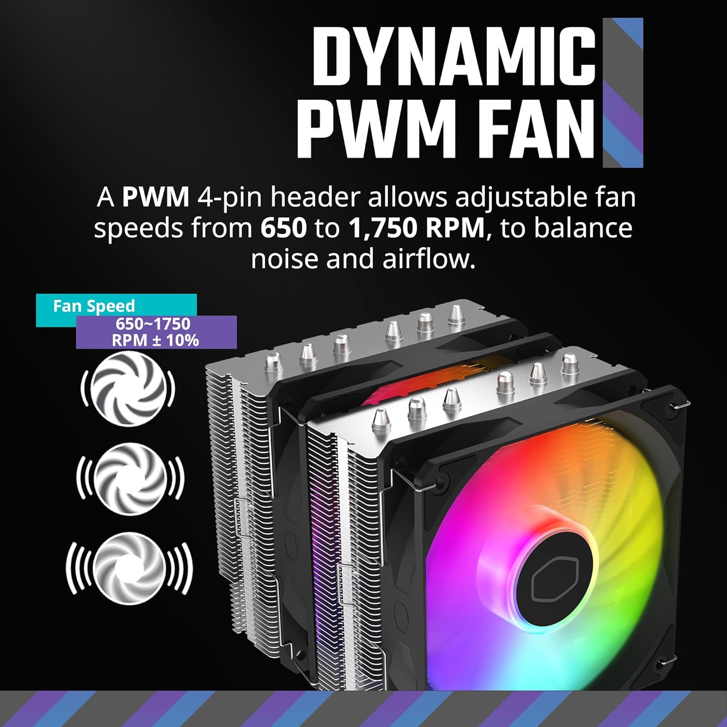 Cooler Master Hyper 620S Dual Tower CPU Air Cooler, ARGB Sync, 120mm PWM Fan, 6 Copper Direct Contact Heat Pipes, 154.9mm Tall Silver