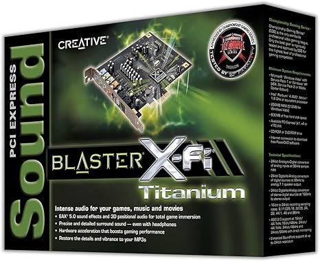 Creative Labs SB0880 PCI Express Sound Blaster X-Fi Titanium Sound Card Compatible Devices: Personal Computer, Speaker, Headphone Brand: Creative Hardware Interface: PCI Audio Output Mode: Surround Platform: Windows 7, Windows Vista About this item: Watch your DVDs in cinematic surround sound with PowerDVD software featuring DTS and Dolby Digital-EX decoding PCI Express Sound Blaster X-Fi Titanium has fantastic inputs and low-latency ASIO drivers for great music recording Hear 3D positional audio so precise, you can locate enemies by sound. Hear crackling gunfire and earth-shattering explosions, EAX 5.0 delivers sound effects that pull you into the game. Boost performance in your favorite games with hardware audio acceleration that will blow your motherboard audio away Hear crackling gunfire and earth-shattering explosions, EAX 5.0 delivers sound effects that pull you into the game. Hear 3D positional audio so precise, you can locate enemies by sound. Boost performance in your favorite games with hardware audio acceleration that will blow your motherboard audio away PCI Express Sound Blaster X-Fi Titanium has fantastic inputs and low-latency ASIO drivers for great music recording Watch your DVDs in cinematic surround sound with PowerDVD software featuring DTS and Dolby Digital-EX decoding