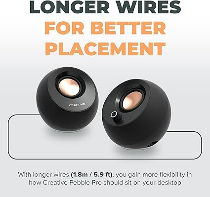 - POWERFUL AUDIO BEYOND ITS SIZE - Creative Pebble Pro incorporates a pair of all-new, powerful digital amps with built-in audio processing capable of delivering 3.5x richer and deeper bass, and a brand-new driver design that has been overhauled from the ground up to achieve more headroom for a louder, and clearer audio performance. This allows the speakers to drive a soundstage that is beyond its physique and across volume levels without skimping on audio clarity