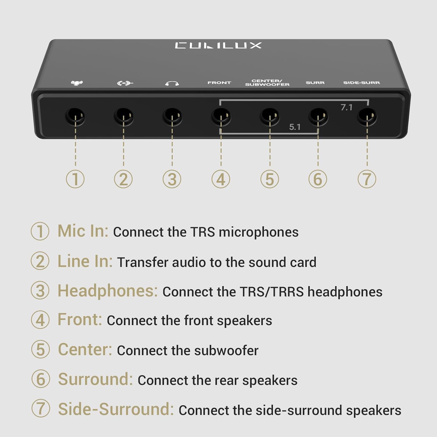 - 【7.1 Surround Sound】Immerse yourself in a rich audio experience with 7.1 & 5.1 USB surround sound, perfect for gaming, movies, and music. It supports stereo headphone output, line-in input, mic input and 5.1/7.1 output.