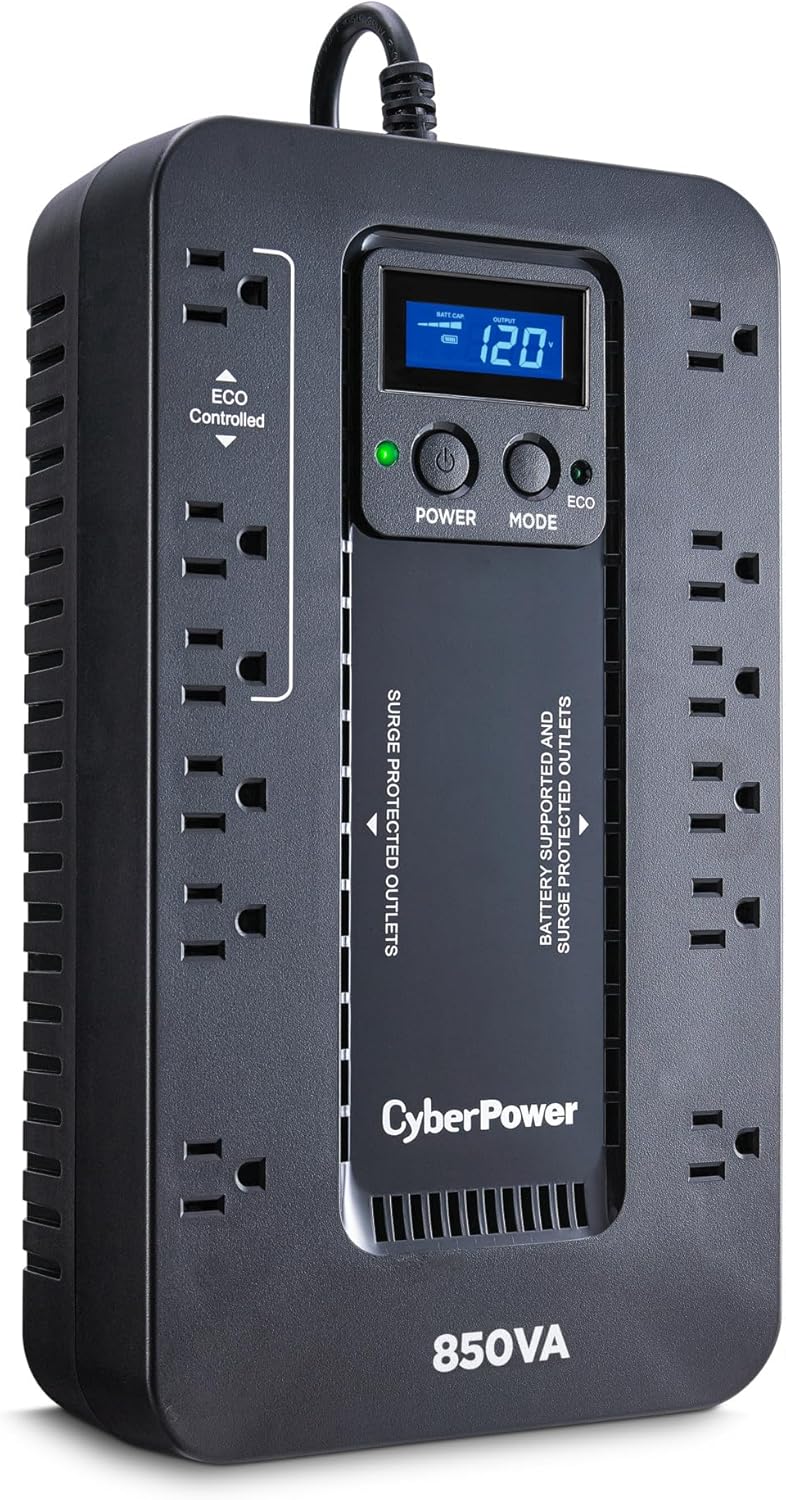 CyberPower EC850LCD Ecologic UPS Battery Backup and Surge Protector, 850VA/510W, 12 Outlets, ECO Mode, Compact, UL Certified Brand: CyberPower Battery... Read more Read more