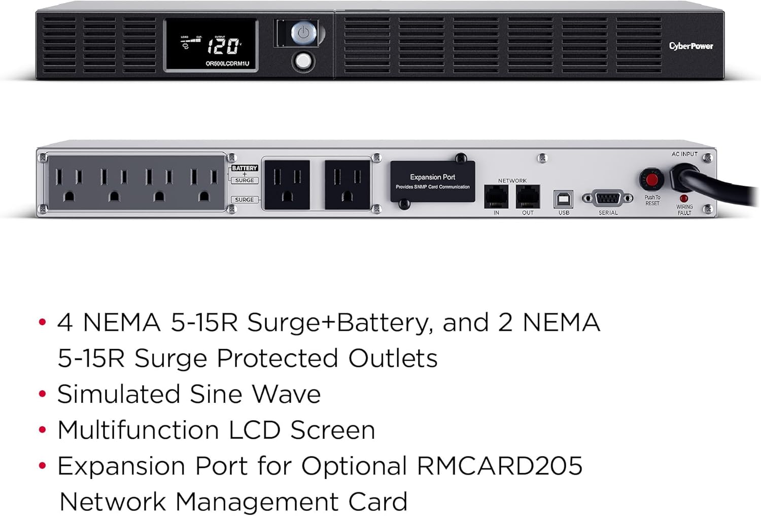 CyberPower OR500LCDRM1U Smart App LCD UPS Battery Backup and Surge Protector, 500VA/300W, 6 Outlets, AVR, 1U Rackmount, UL Certified Brand:... Read more Read more