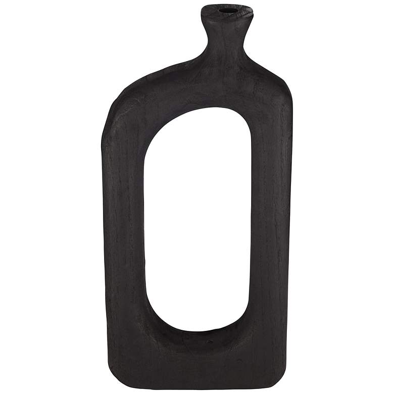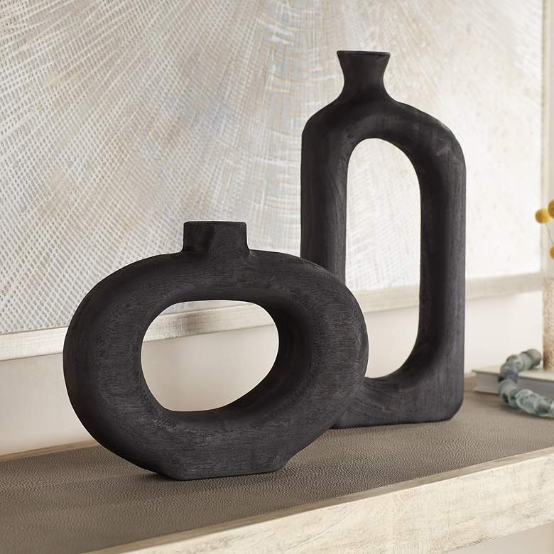 A hollow center creates bold style for this two-piece modern decorative vase set. From the Amaranth collection by Dahlia Studios, one vase features a square shape and the other a round shape, both crafted from wood with plenty of surface texture, including spots, pits, and cracks that bring a sense of authenticity. A black finish plays up the textural details to perfection, creating centerpiece-worthy designs for your home.