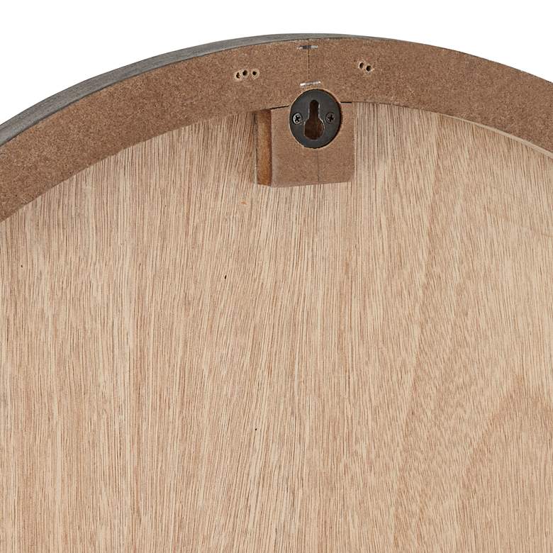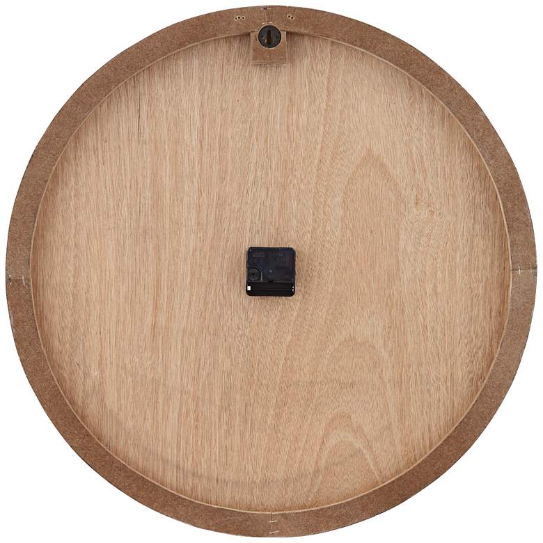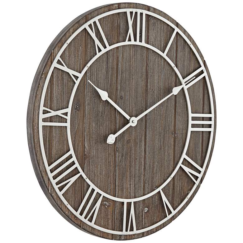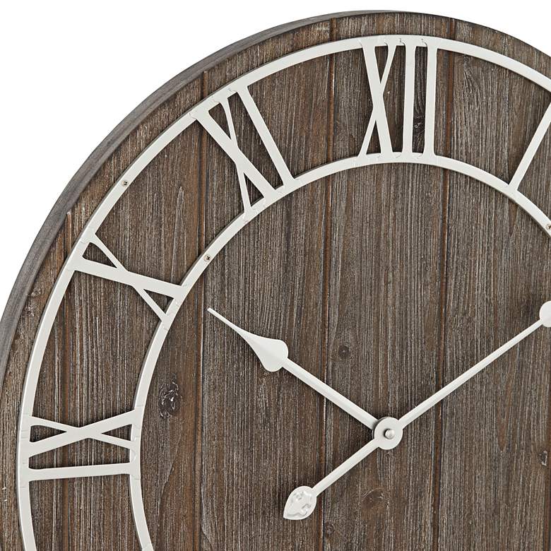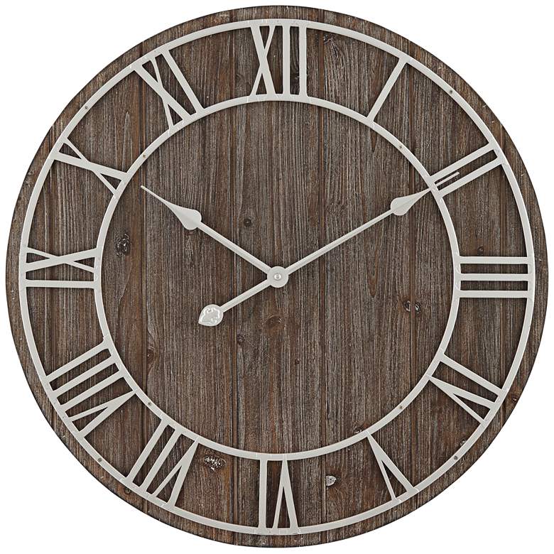 Add a rustic touch to your entry or kitchen with this traditional round wall clock. From the Dahlia Studios brand, it boasts a matte dark gray wood grain finish over its face, creating a rugged, earthy sensibility. An antique white metal overlay adds Roman numerals and decorative clock hands that create contrast so the clock is easy to read from anywhere in the room.
