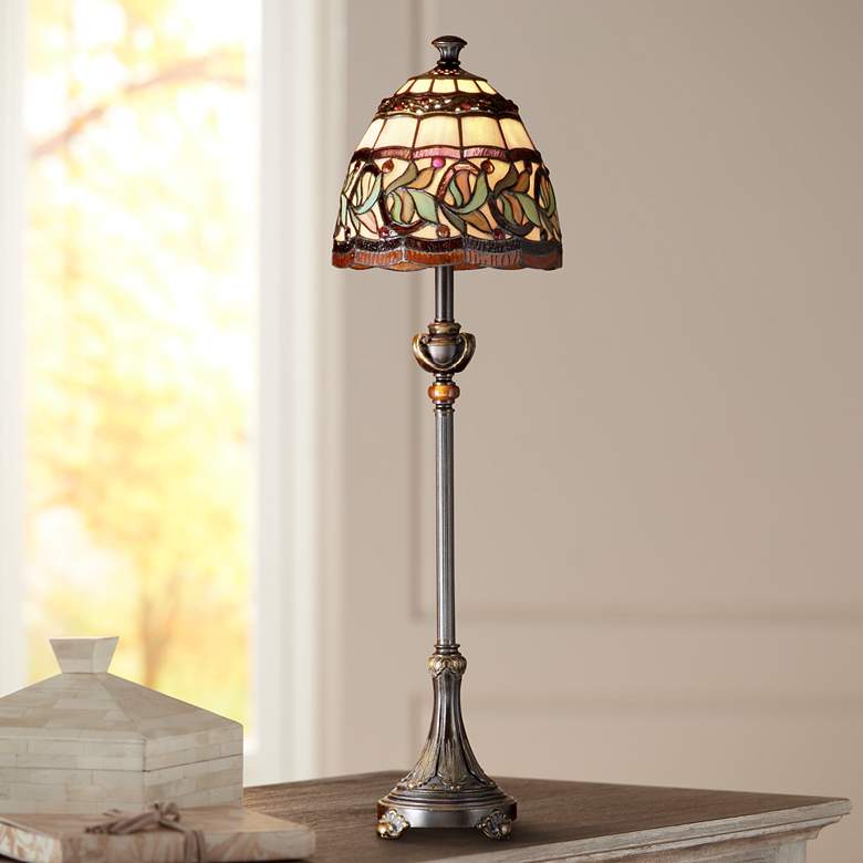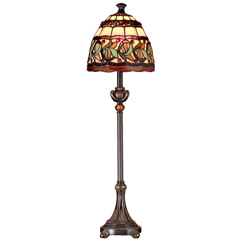 - Tiffany-style buffet table lamp from the Dale Tiffany brand. Glass shade has a decorative flower and leaf pattern.