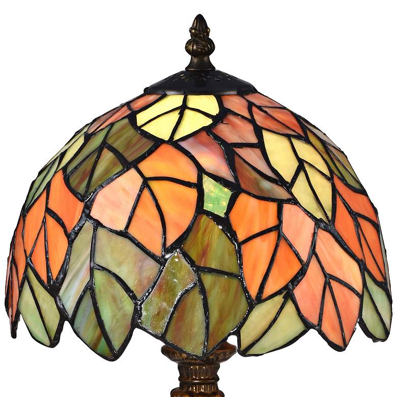 An art dome shade with a lifelike scarlet, orange and amber leaves pattern distinguishes this accent table lamp from Dale Tiffany. Its base column uses antique bronze finish to bolster its understated details. The in-line switch is a convenient feature for improving control over the lighting. Hand-rolled Tiffany-style art glass dome shade features over 90 hand-cut pieces. Scarlet, orange and amber colors in a leaf pattern. Assembled using the traditional copper foil soldering technique.