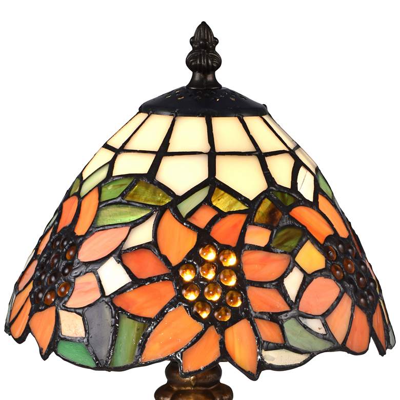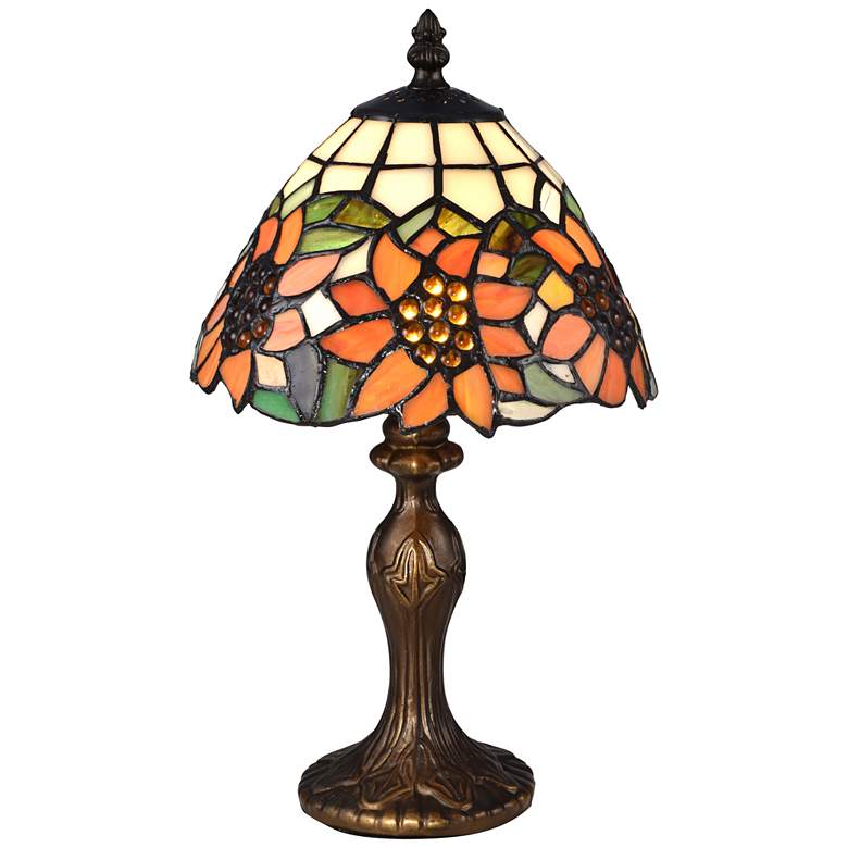 The Tiffany-style art glass dome shade on this accent table lamp from Dale Tiffany is hand-rolled, with an orange and yellow sunflower pattern against a light amber grid background. Its antique bronze finish highlights subtle details on its base. The convenient in-line switch allows ensures stress-free functionality during use.