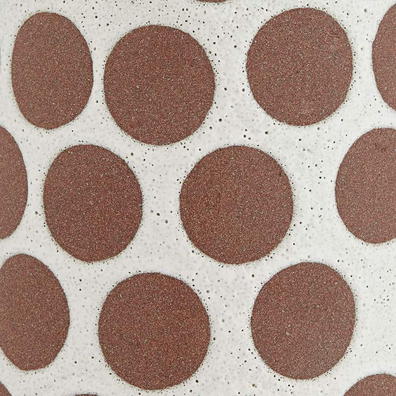 A modern stoneware vase is hand-made, offering stylish artisan flair in a kitchen or living area. It features a tall pitcher-inspired silhouette, complete with a handle and subtle pour spout. Its matte white finish is enhanced with warm brown polka dots and handle, perfect for adding dimension to a rustic or farmhouse centerpiece. Add fresh-cut flowers or dried grasses to complete the look in your space.