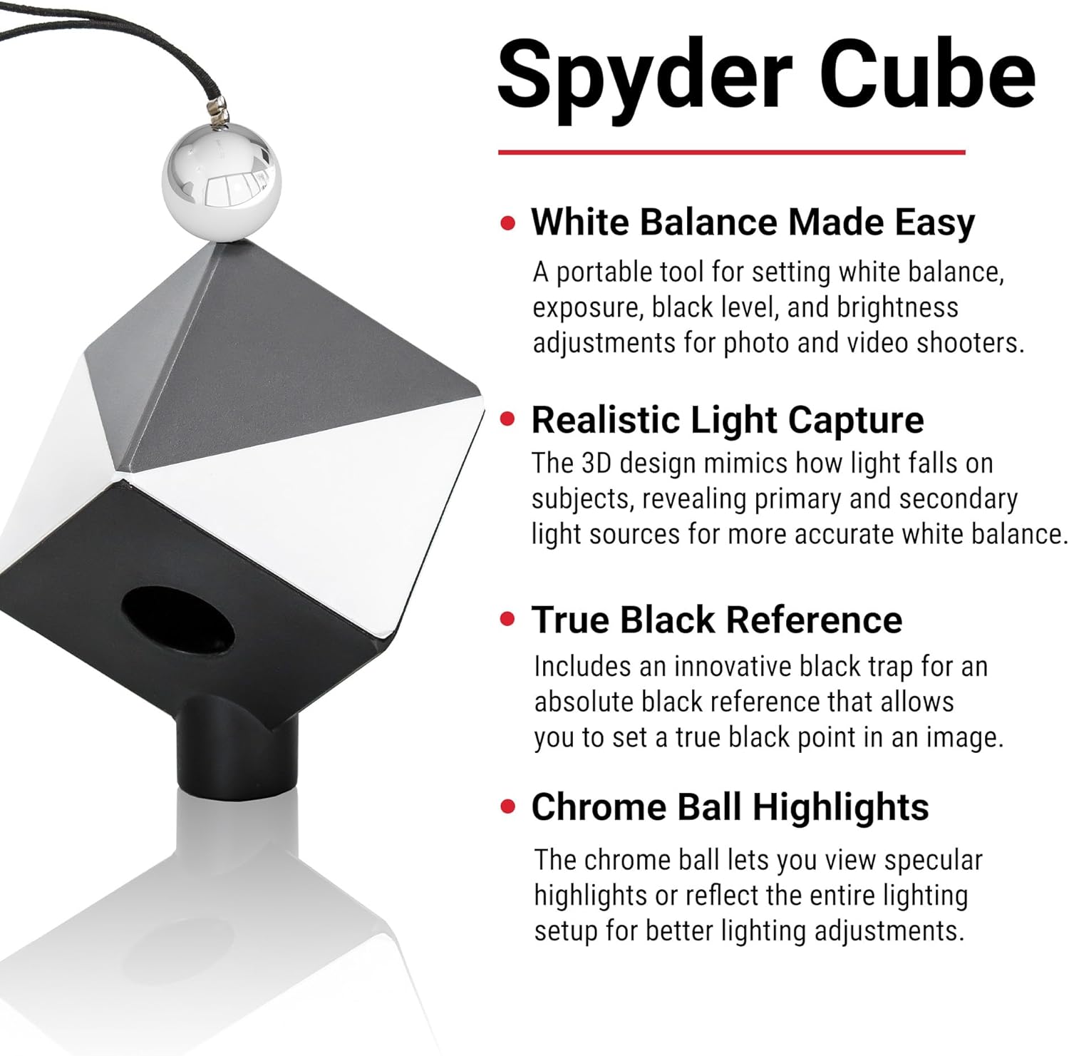 - ACCURATE WHITE BALANCE: Spyder Cube ensures proper white balance, which is essential for colour accuracy. Its patented 3D design does more than a grey card. Set absolute white and zero black values and define your neutral grey for an ideal contrast ratio