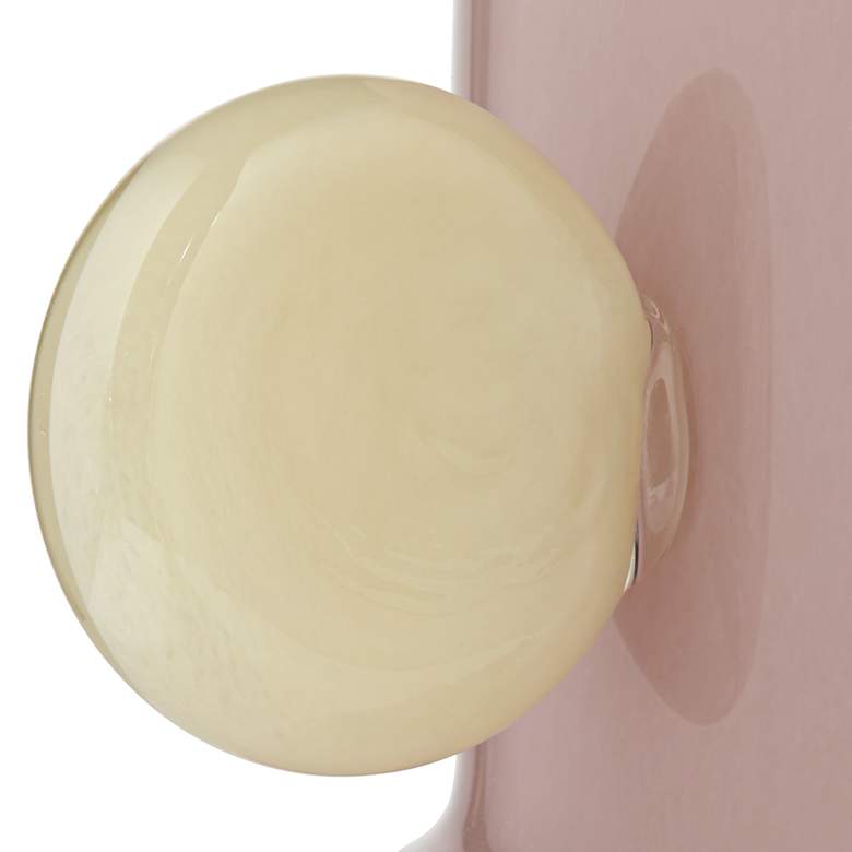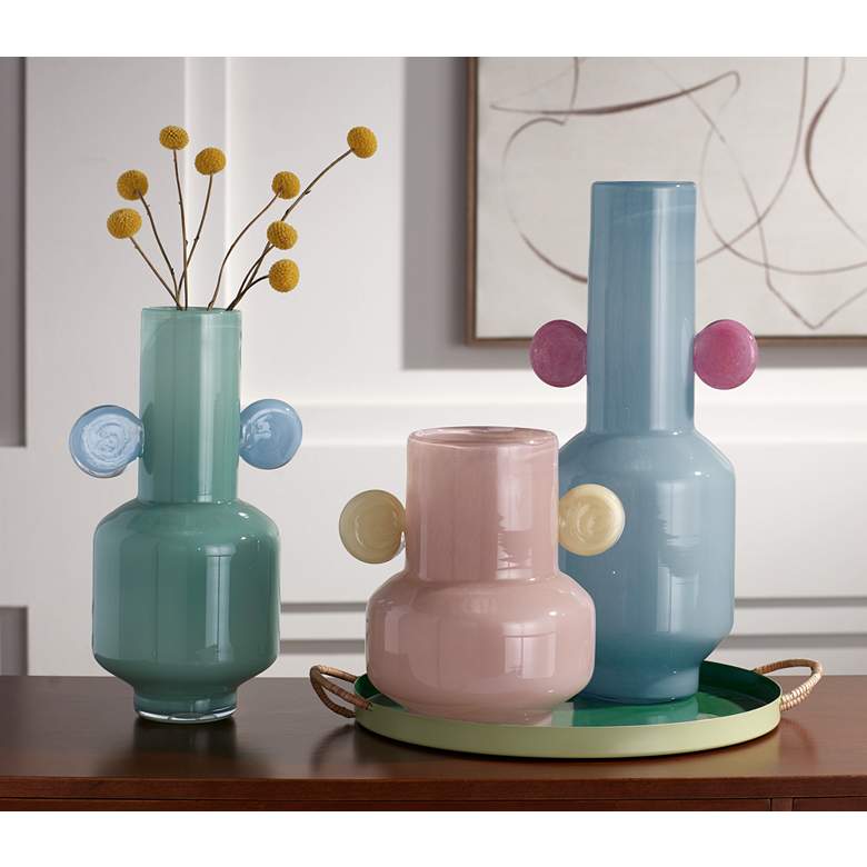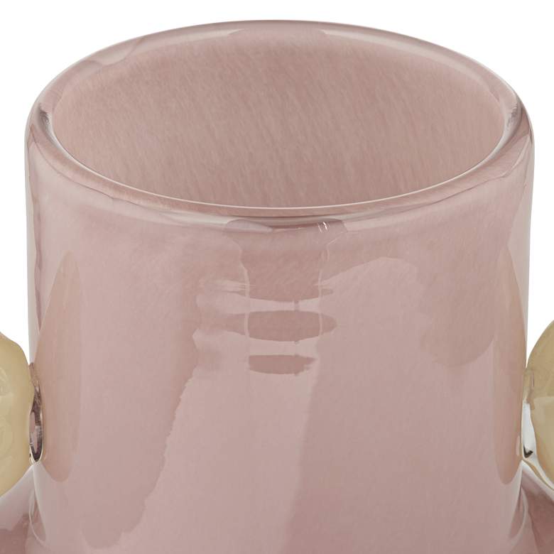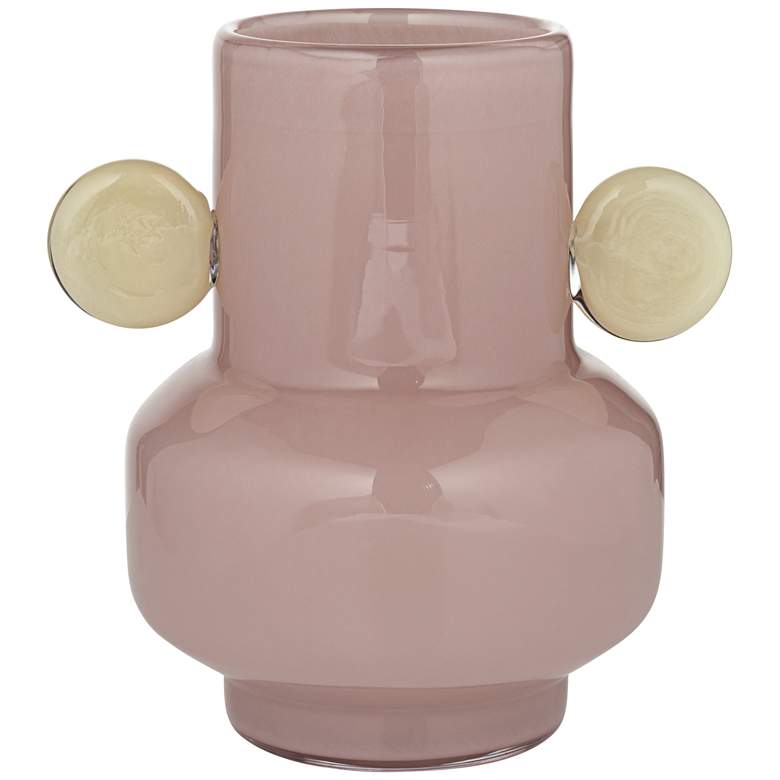 Create a centerpiece or add color to your sideboard with this petite modern glass decorative vase. From Studio 55D, it boasts an opaque pink finish and features a pair of round yellow handles. The glossy glass offers industrial flair with its intriguing silhouette, perfect for everything from flowers from the garden to dried grasses.