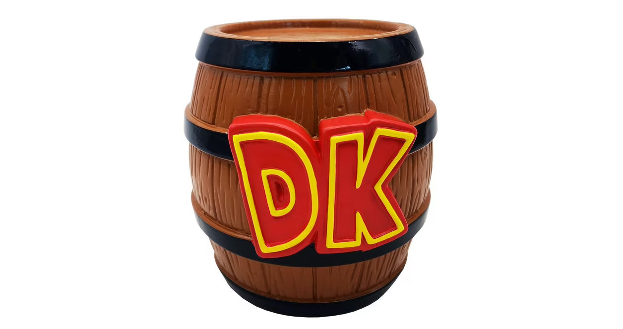 Don't pick up this coin bank and throw it -- put your spare change in it, instead! Inspired by Donkey Kong, this coin bank is shaped like the barrels throughout the game levels, with the large DK on them. The coin slot is at the top, and there's a rubber stopper at the bottom.