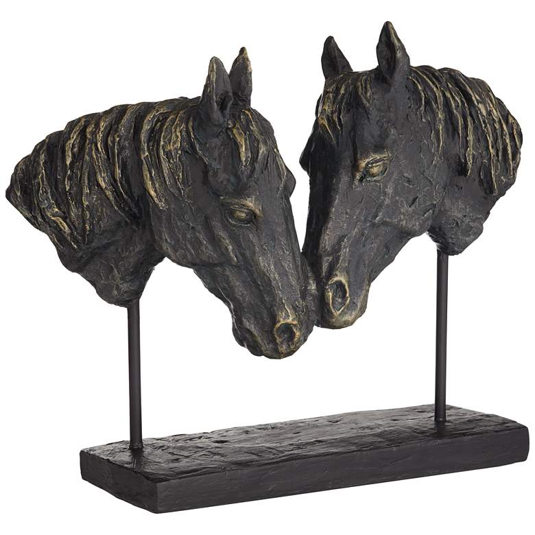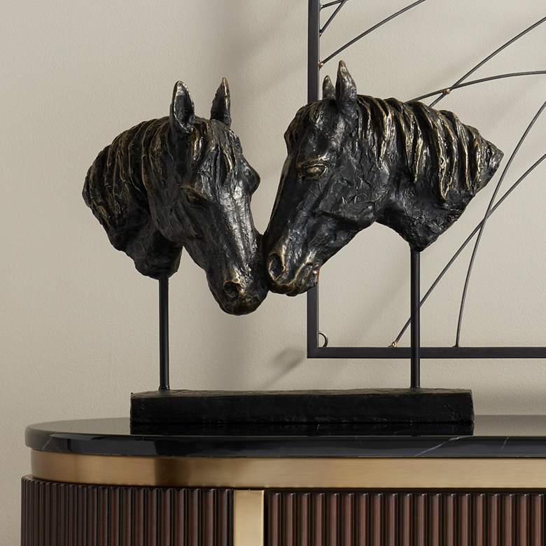 Designed by Kensington Hill, this traditional double horse bust statue is a striking addition in a den or living room. It shows off a hand-painted, rugged bronze finish complete with golden highlights the brighten the mane, eyes, and mouth of each horse head statue. The two heads are posed on slim supports turning into one another as though greeting an old friend. A stylish way to bring an equestrian element to your favorite room.