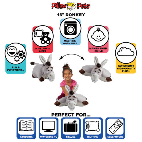 DONKEY! The most lovable and humorous sidekick from the Shrek franchise, Donkey is now a Pillow Pet featuring his signature large, expressive eyes, long ears, and his especially toothy, goofy smile! Who can resist this super adorable sidekick and best four-legged friend ever! Yeeeeehaw!