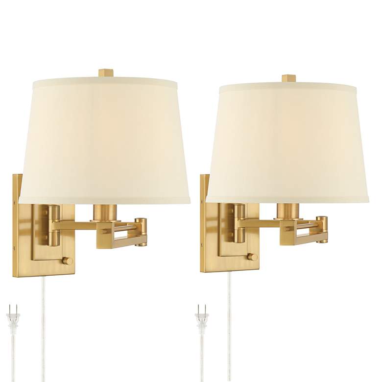 This set of two warm gold plug-in swing arm wall lamps is a beautiful look for bedrooms, reading chairs and more. The design features an adjustable swing arm that's perfect for reading or other tasks. It comes in a matte bronze finish over steel construction. The fabric drum shade softens the light throw. Cord cover not included, sold separately.