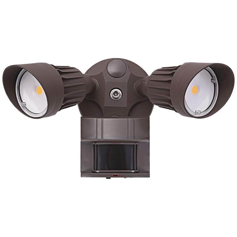 A great choice for outdoor walkways, garage areas, back door entrances and more, this 2-lamp security flood light is a bright energy saver. It comes with two built-in, high-power LED arrays that use a mere 10 watts of power each, yet have a light output comparable to a 120 watt bulb. The design also has a built-in motion detector with a 70-foot maximum range and works from dusk to dawn. Pivoting arm on each light allows you to aim light where it's needed. Durable bronze finish aluminum housing.
