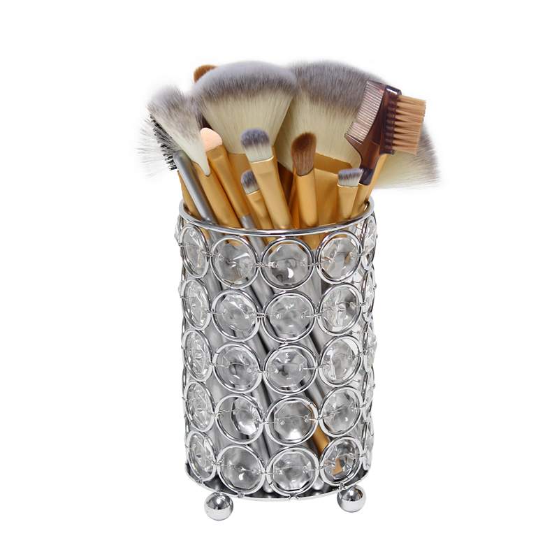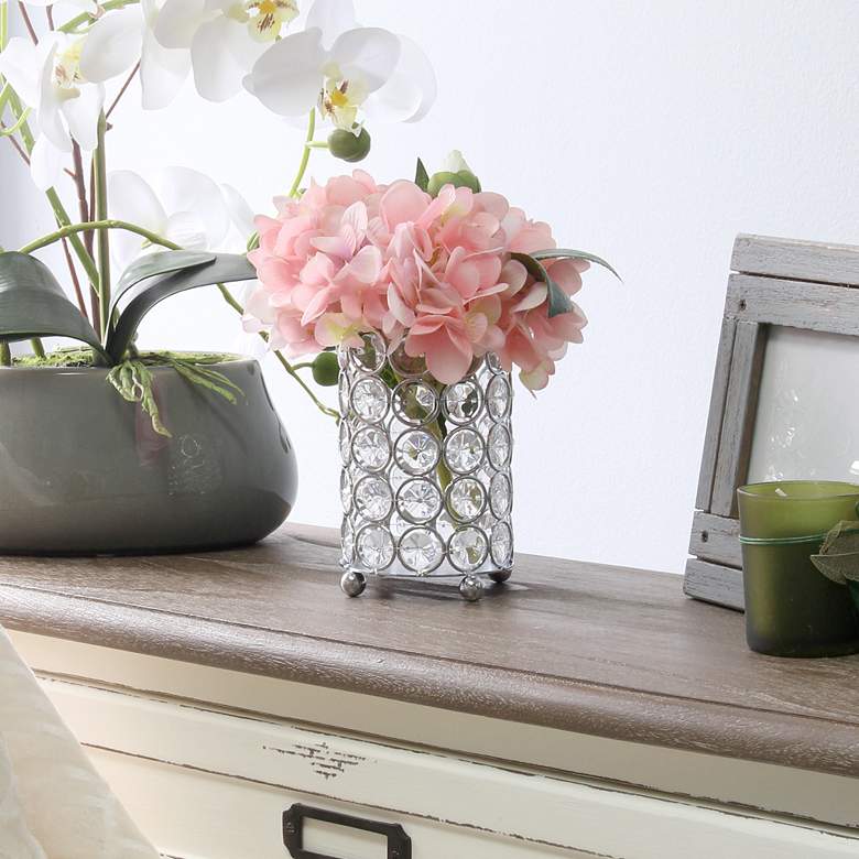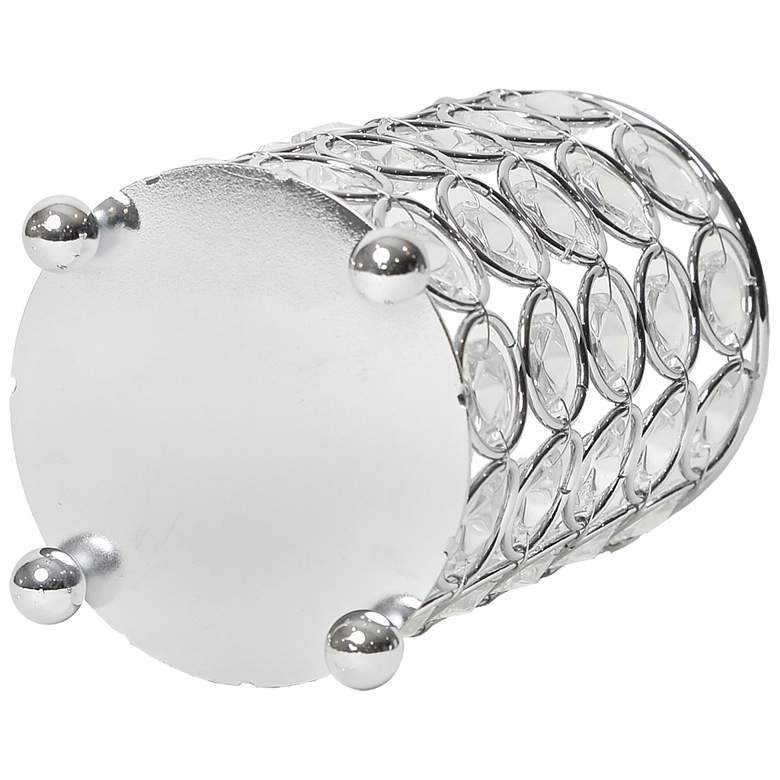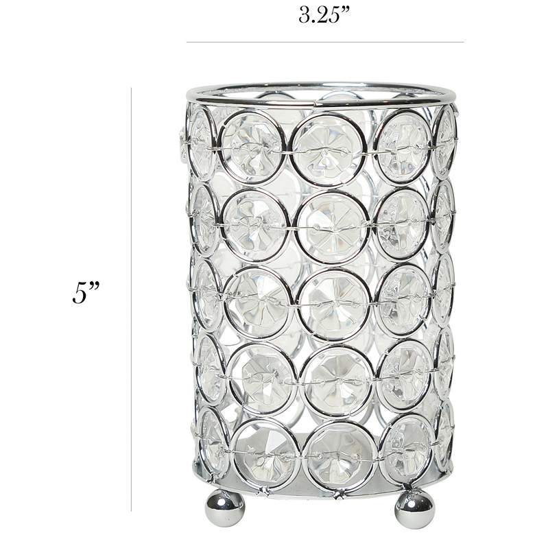 Sparkling elegance lights up any space, and this chic, gleaming crystal and chrome decorative candle holder fits right in. Faceted emblems line up symmetrically, fashioned from K5 crystal and rimmed by chrome finish metal. Ball shape metal feet add a fun touch to this decadent candle holder from the Elipse collection by Elegant Designs. Suitable for faux florals and unlit candles, as water and heat may cause damage.