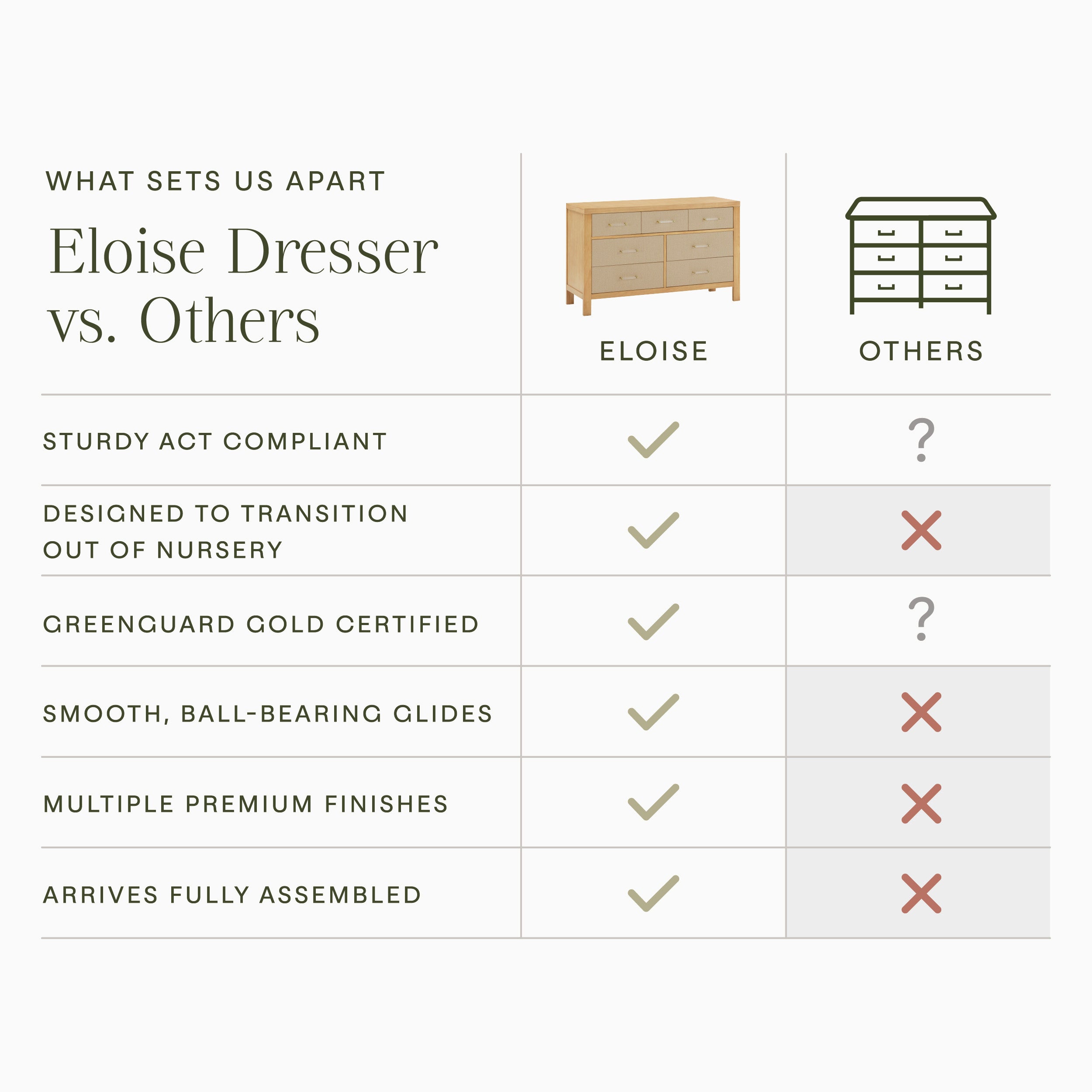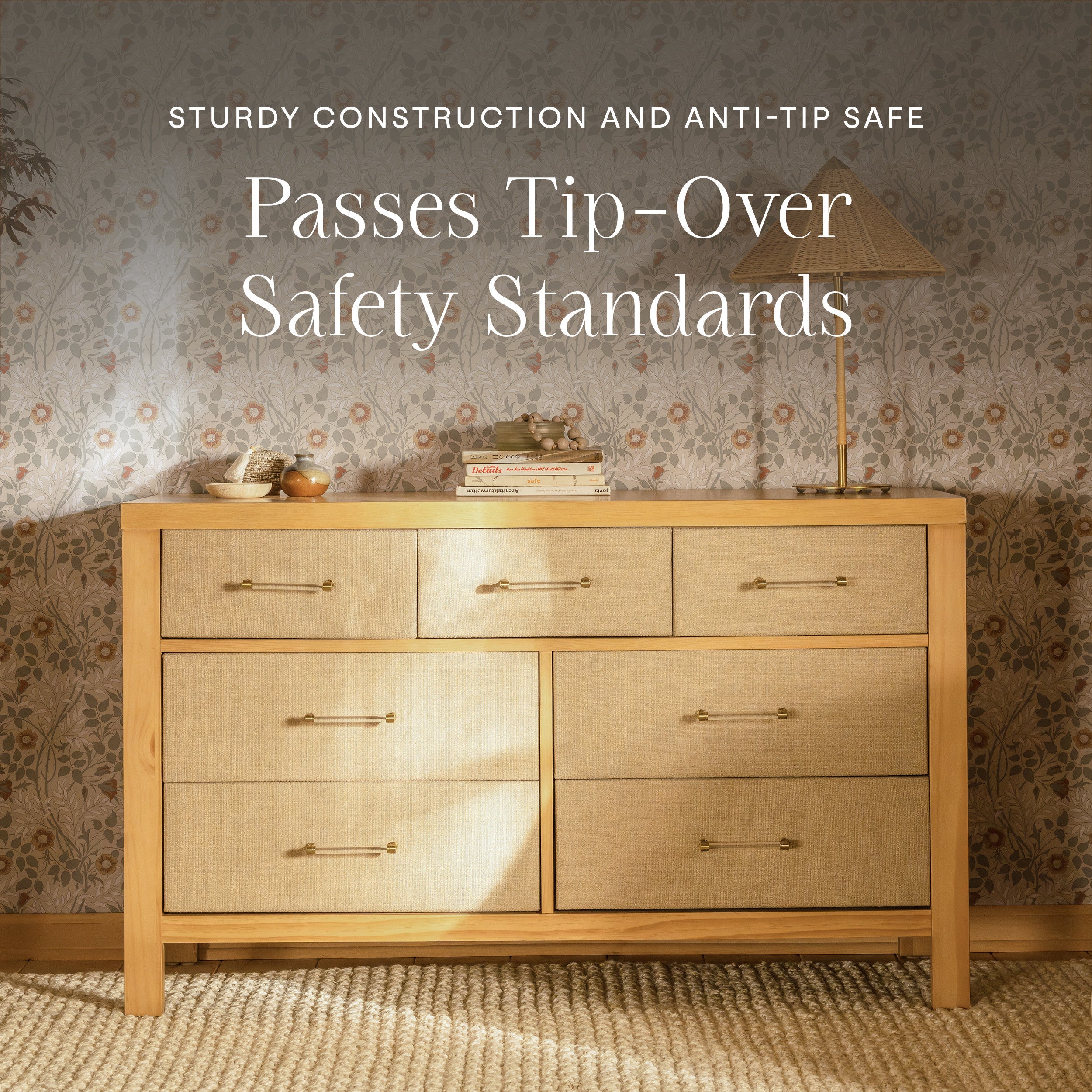 With its timeless silhouette and heirloom-quality fabric, our Eloise 7 Drawer Dresser has a place in any nursery – traditional, modern, or eclectic. The fabric detailing adds depth, character, and a touch of nature-inspired charm to each piece. Swoon-worthy acrylic and gold handles add just the right amount of drama (the good kind) to your home. The dresser provides ample storage space for clothing, blankets, and more. Its versatility ensures that it will seamlessly transition from a nursery staple to a sophisticated piece in any room of your home.