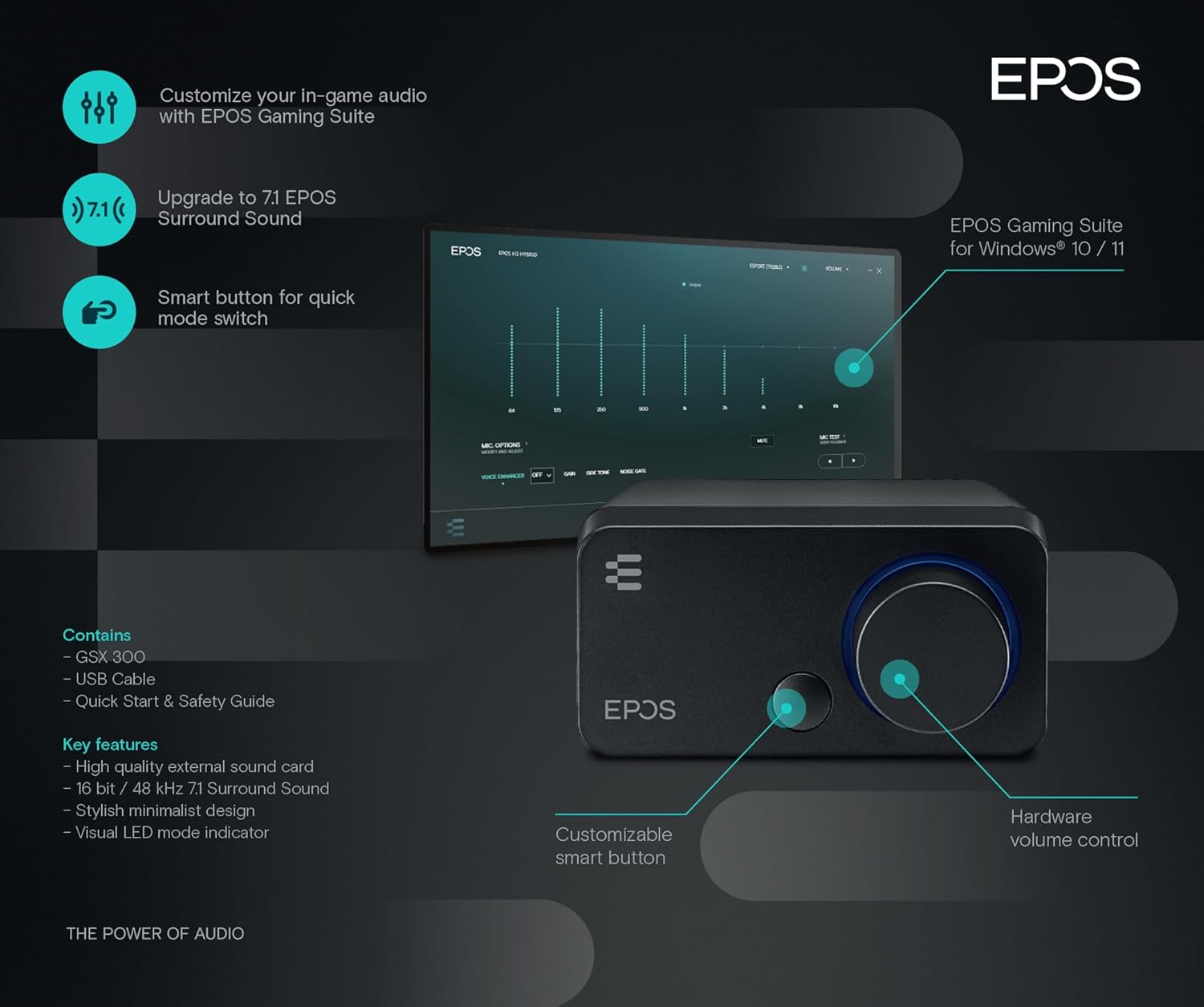EPOS GSX 300 - External Computer Sound Card - High-Resolution Stereo & 7.1 Surround Sound - LED Volume Dial; Customizable Smart Button - Windows 10 Synchronized