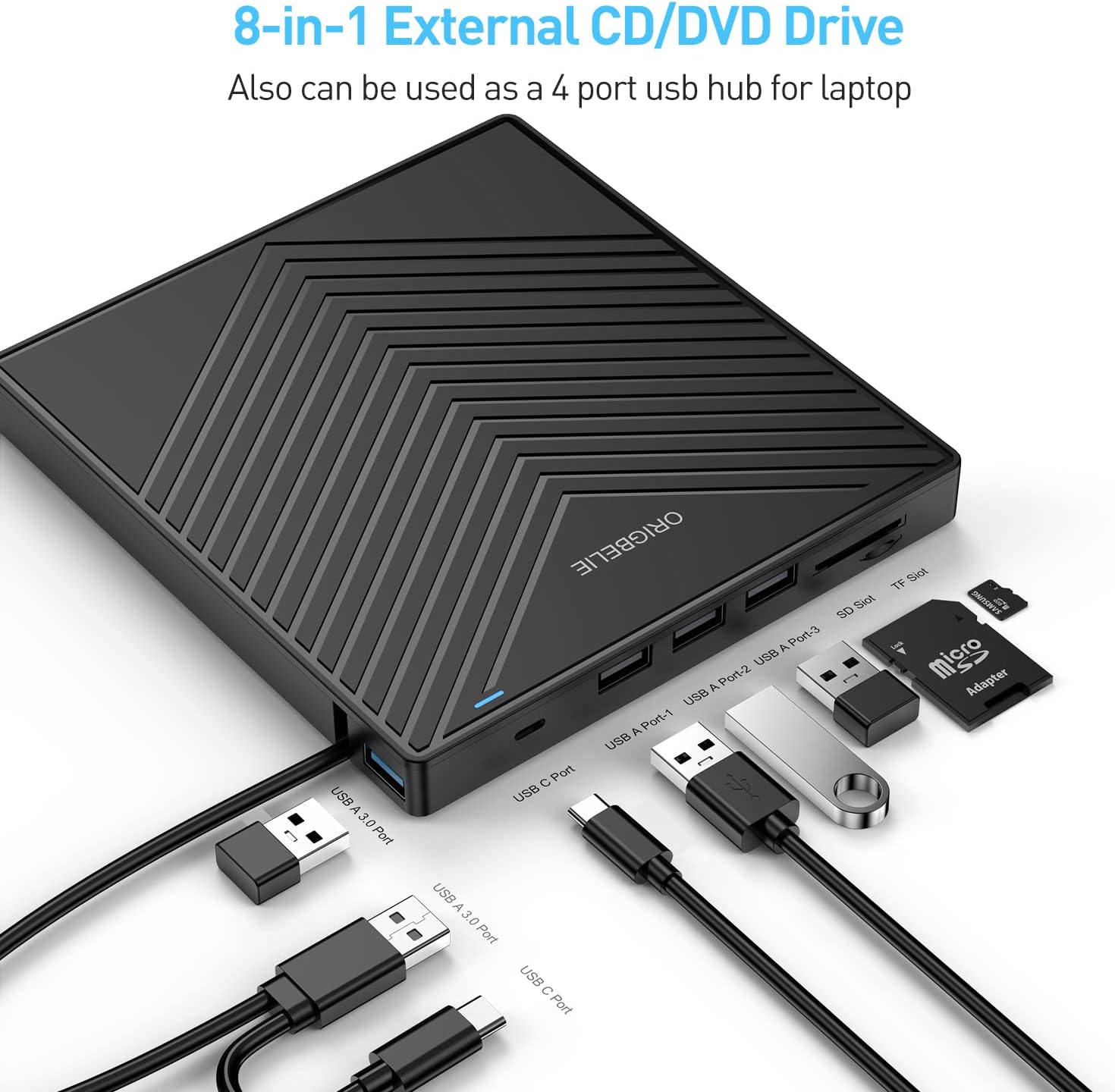 - 【8 IN 1 USB HUB】- Our external drive can not only burn and read CD DVD, but also can be used as a external laptop usb hub, including 1 USB 3.0 port, 3 USB 2.0 port, 1 TF slot ,1 SD card slot and 1USB C Port, compatible with usb hard drive, limited/wireless mouse & keyboard, computer radiator and other usb computer accessories, The card slot are perfect for transferring photo and video files by your camera from cards to your computer(Note: SD port and TF port cannot be used at the same time)