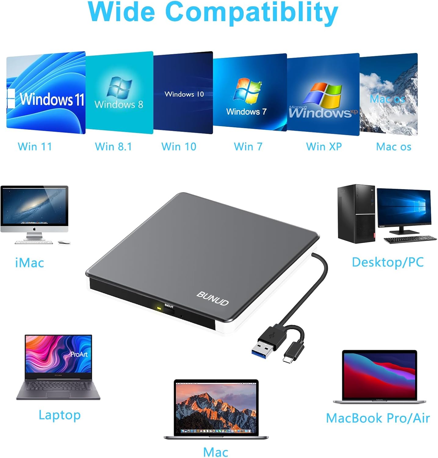 - 【Wide Compatibility】External CD drive is compatible with Windows 11/10/8.1/7/Vista/XP/98/SE/ME/2000, Linux and all versions of Mac OS. You can use external CD DVD drive on almost all computers such as MacBook Pro/Air, iMac, Mac Mini, Laptop, and Desktop, PC, all-in-one computers. Please note: This DVD drive external can not work for iPad/ Tablet/ Projector/ TV/ Chrome OS/ Car/ Smart Phone/Blu-ray/4K disc.