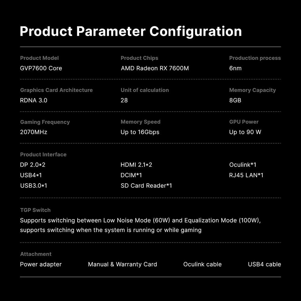 - PORTABLE SIZE - The GVP7600M features a compact size of 16.4 × 11.1 × 4.0 cm and a weight of only 0.7kg. Its lightweight and compact design make it convenient to carry and fit seamlessly into your gaming setup. Whether you are gaming at home or on the go, the GVP7600M offers top-tier graphics performance wherever you are. (IMPORTANT: Do not stand the unit vertically as it will block the cooling vents.)