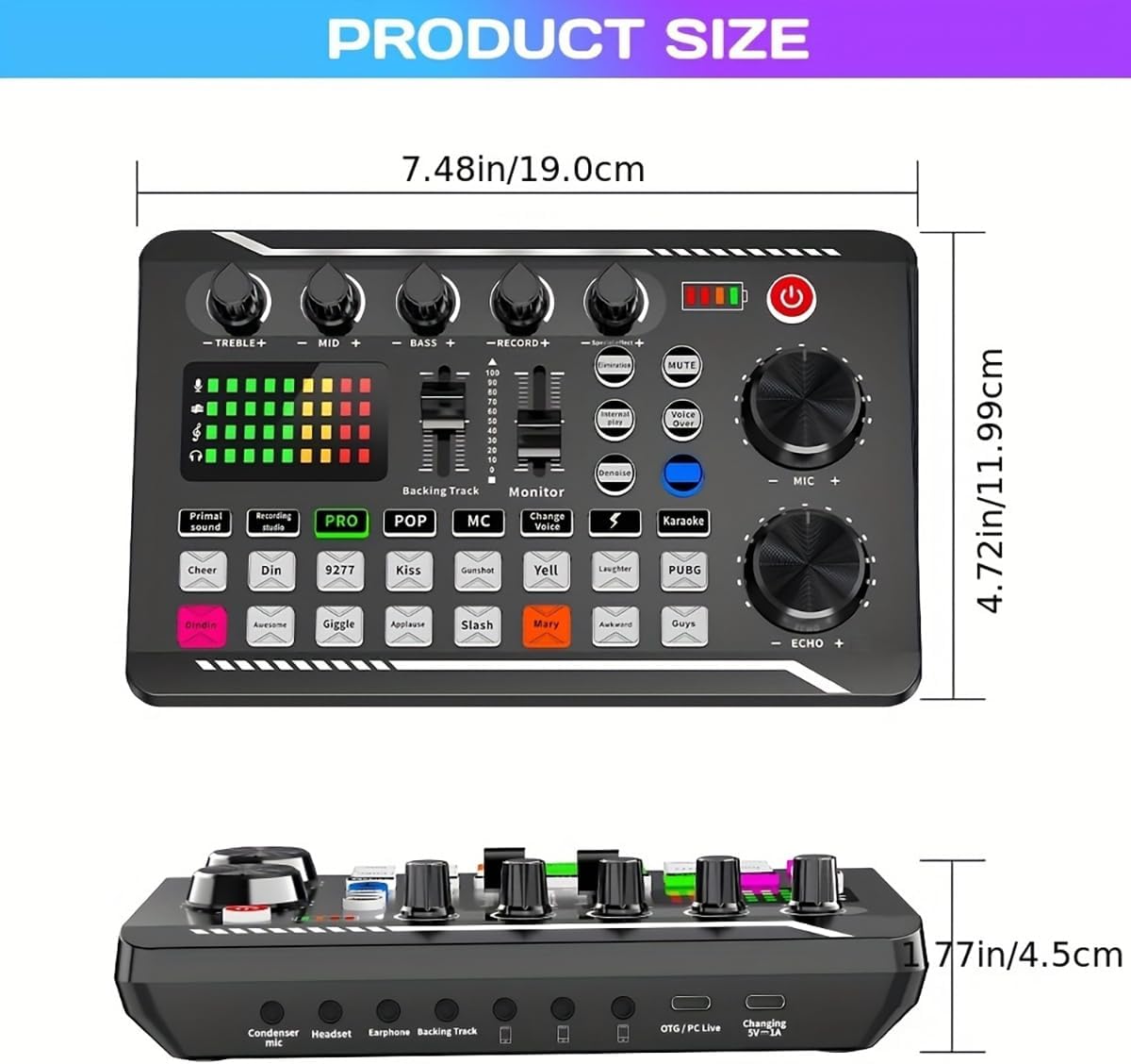- Professional DJ Mixer & Voice Changer: Imported DSP dual chip delivers studio-grade 120kHz/24-bit audio clarity. Features 16 fixed sound effects, 7 recording modes, 4 voice changer modes, and 4 pro functions (Denoise/Elimination/Voice Over/Internal Play) for dynamic live streams or podcasts
