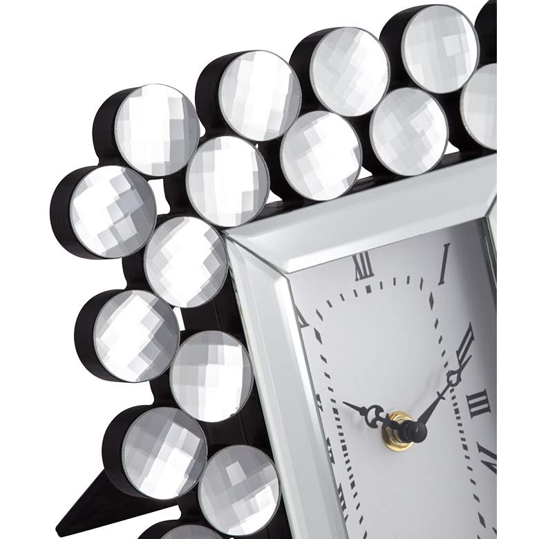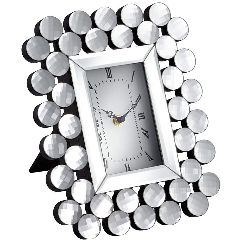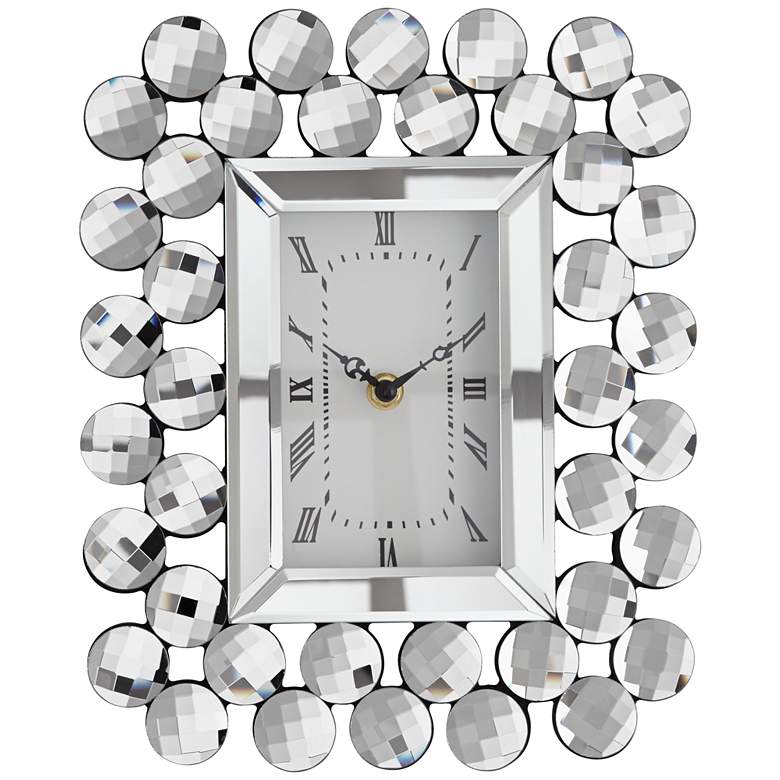 Keeping time doesn't have to be a mundane chore. This mirrored tabletop clock from the Dahlia Studios brand will keep you on time in style. It features a mirrored frame made up of round segments arranged around a rectangular clock face. Classic Roman numerals in black are on the clock face. The battery powered clock design means you can place it anywhere, from your bedside table to a living room display.