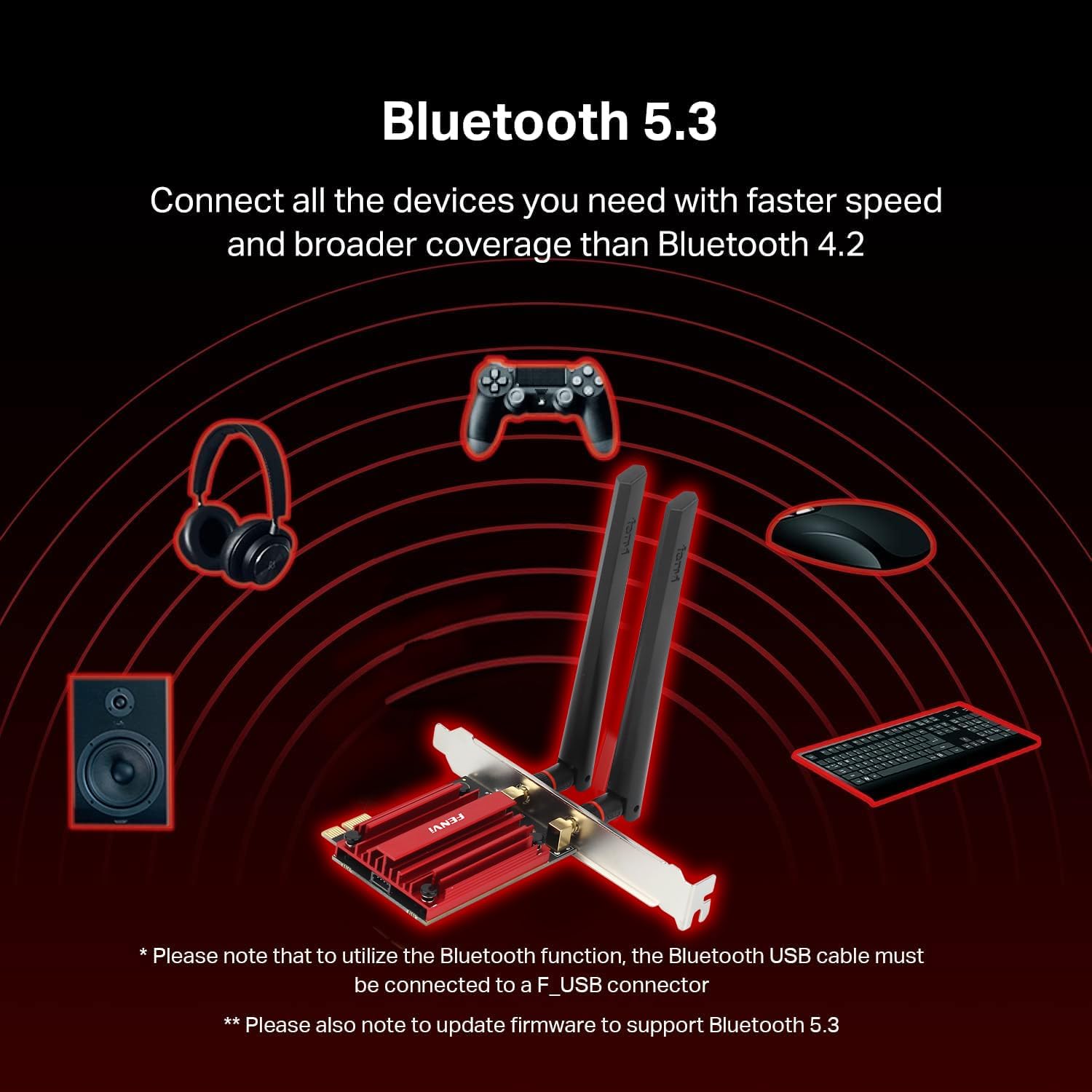 - Bluetooth 5.3 Tech: WiFi 6E PCIe Bluetooth adapter is compatible with the latest Bluetooth 5.0 Technology, achieving 2× faster speed and 4× broader coverage than Bluetooth 4.2, also backward compatible with Bluetooth 4.0. Full compatibility for Bluetooth 5.2/5.0/4.2/4.0 devices.9 Pin USB header is required from the motherboard for Bluetooth functionality.