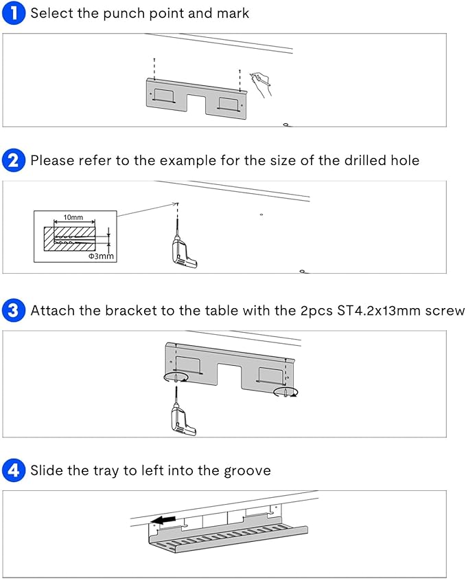 - Easy Installation: Easily mount and install the desk cable organizer on any desk edge or surface! Just need to drill two holes under the desktop. Please consider whether the desktop material or thickness suits drilling holes.