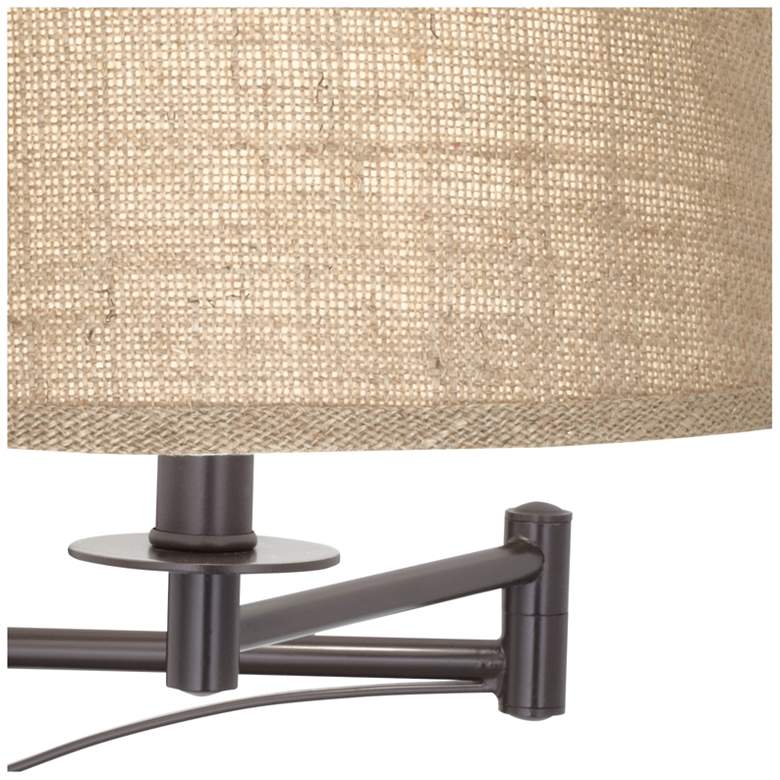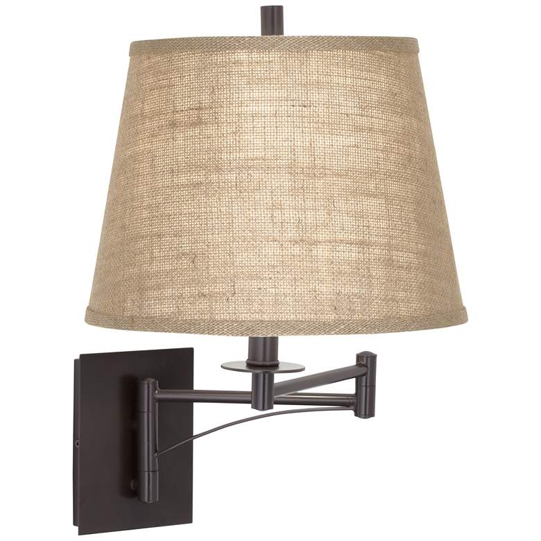 Finished in a rich, matte brown, these swing arm wall lamps set of two are topped with a natural burlap hardback shade, creating an attractive and functional way to add light to your bedside or favorite seating area. The dimmable design allows you to customize the amount of light for reading and more. It's a plug-in, meaning installation is easy; just attach the lamp to the wall and plug it into any standard outlet using the provided cord.