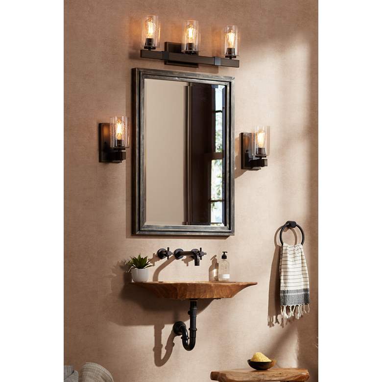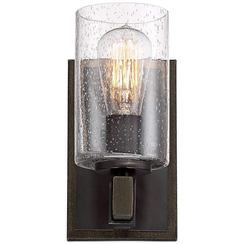 From the Poetry Collection by Franklin Iron Works, this set of two single-light wall sconces is a wonderful blend of rustic and industrial tastes. The wood finish accents stand out against the smooth bronze finish of the backing and socket. A clear seedy glass shade gives a creative touch to this accent piece.