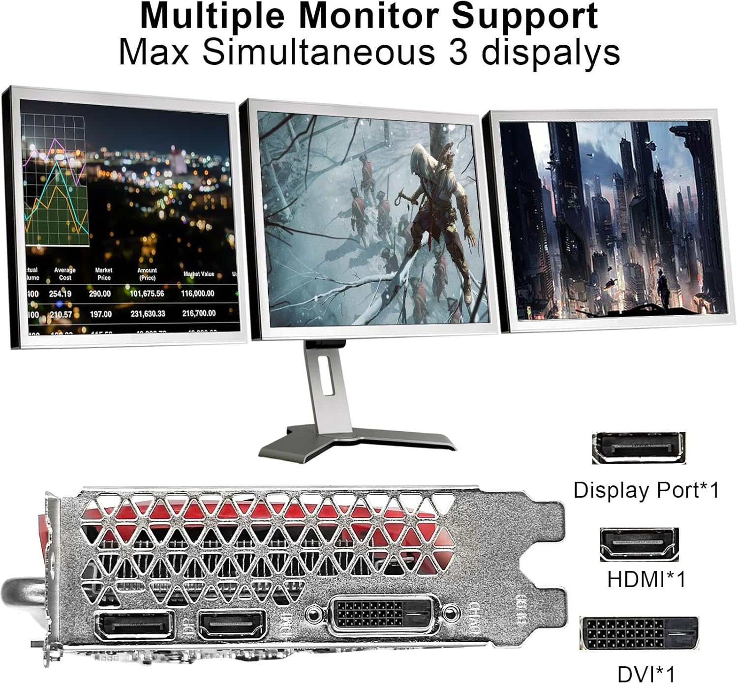 - 【High Definition Display Effect 】GTX 1660S 6GB Graphics Card has 3 monitor support ouput included 1X DVI Port+ 1X Display Port + 1X HDMI Port, can support three monitors. GTX 1660 super is connected to the rest of the system using a PCI-Express 3.0 x16 interface, supports up to 8K display, delivers more higher definition pc gaming effect.