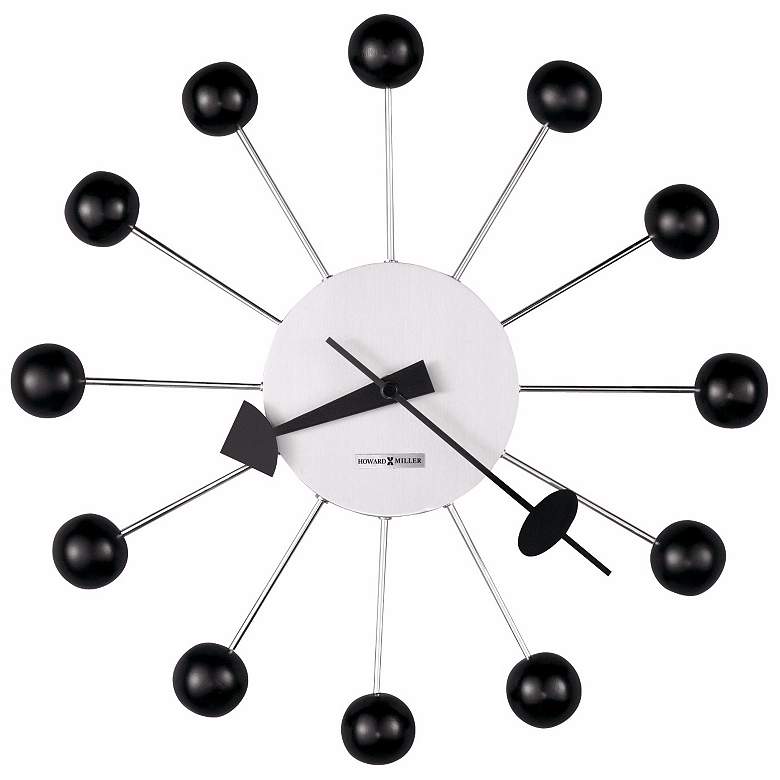 This retro-styled wall clock is an adaptation of a classic George Nelson design produced by Howard Miller in the 1950s. It features a brushed nickel finish center surrounded by 12 black satin finish balls