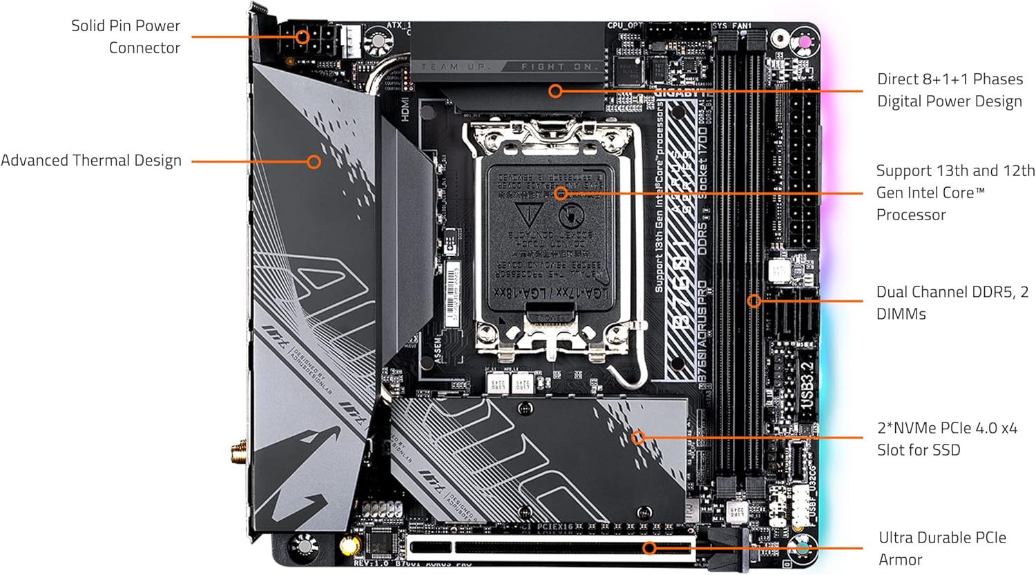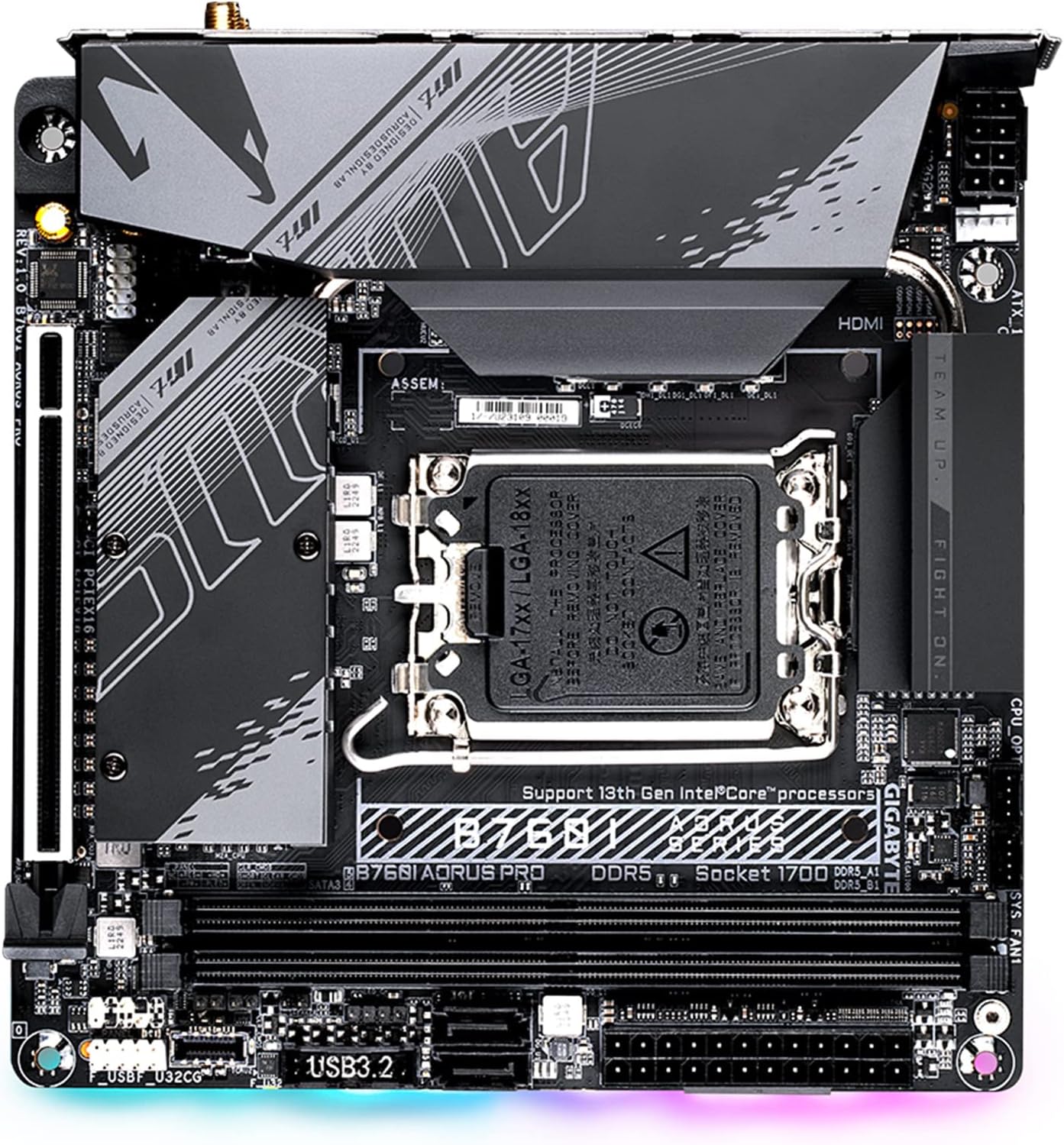 GIGABYTE B760I AORUS PRO (LGA 1700/ Intel/ B760/ Mini-ITX/ DDR5/ Dual M.2/ PCIe 4.0/ USB 3.2 Gen2X2 Type-C/WiFi 6E/ Intel... Read more Read more