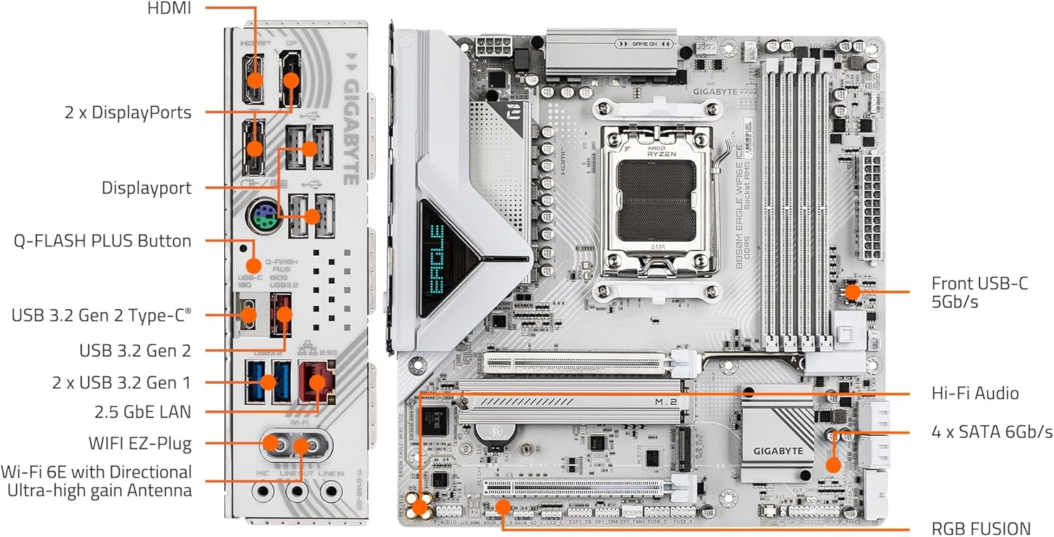 GIGABYTE B850M Eagle WIFI6E ICE AMD AM5 Motherboard, M-ATX, DDR5, 2X M.2, PCIe 5.0, USB-C, USB 3.2 Gen 2, WIFI6E, 2.5GbE LAN, EZ-Latch, Wi-Fi EZ-Plug Brand: GIGABYTE CPU Socket: Socket AM5 Compatible Devices: Personal Computer RAM Memory Technology: DDR5 Compatible Processors: AMD Ryzen AM5 Chipset Type: AMD B850 Memory Clock Speed: 5200 MHz Platform: Windows 11 Model Name: B850M EAGLE WIFI6E ICE Main Power Connector Type: 24-Pin About this item: AMD Socket AM5: Supports AMD Ryzen 9000 / Ryzen 8000 / Ryzen 7000 Series Processors DDR5 Compatible: 4*DIMMs Power Design: 8+2+2 Connectivity: PCIe 5.0, 2x M.2 Slots, USB-C DIY Friendly: M.2 EZ-Latch, PCIe EZ-Latch, Wi-Fi EZ-Plug