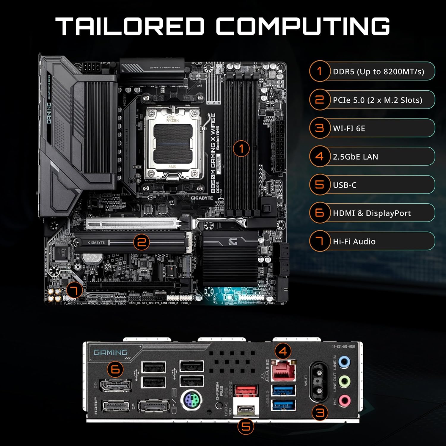 GIGABYTE B850M Gaming X WIFI6E AMD AM5 LGA 1718 Motherboard, mATX, DDR5, 2X M.2, PCIe 5.0, USB-C, WIFI6E, 2.5GbE LAN,... Read more Read more