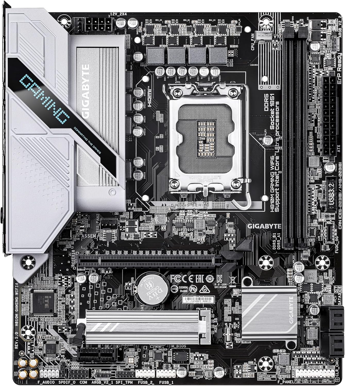 GIGABYTE H810M Gaming WIFI6 Intel Core Ultra (Series 2) LGA 1851 Motherboard, mATX, DDR5, 1x M.2, PCIe 5.0, USB-C, WIFI6, 2.5GbE LAN, EZ-Latch Brand: GIGABYTE CPU Socket: LGA 1851 Compatible Devices: Personal Computer RAM Memory Technology: DDR5 Compatible Processors: Intel Core Ultra (15th Gen) Arrow Lake Chipset Type: Intel H810 Memory Clock Speed: 5600 MHz Platform: Windows 11 Model Name: H810M GAMING WIFI6 Main Power Connector Type: 24-Pin About this item: Supports Intel Core Ultra Processors (Series 2) DDR5 Compatible: 2*DIMMs Thermals: VRM Thermal Armor, M.2 Thermal Guard Connectivity: PCIe 4.0, 1x M.2 Slots, USB-C, HDMI, DisplayPort DIY Friendly: M.2 EZ-Latch, PCIe EZ-Latch, WIFI EZ-Plug, EZ Debug Zone