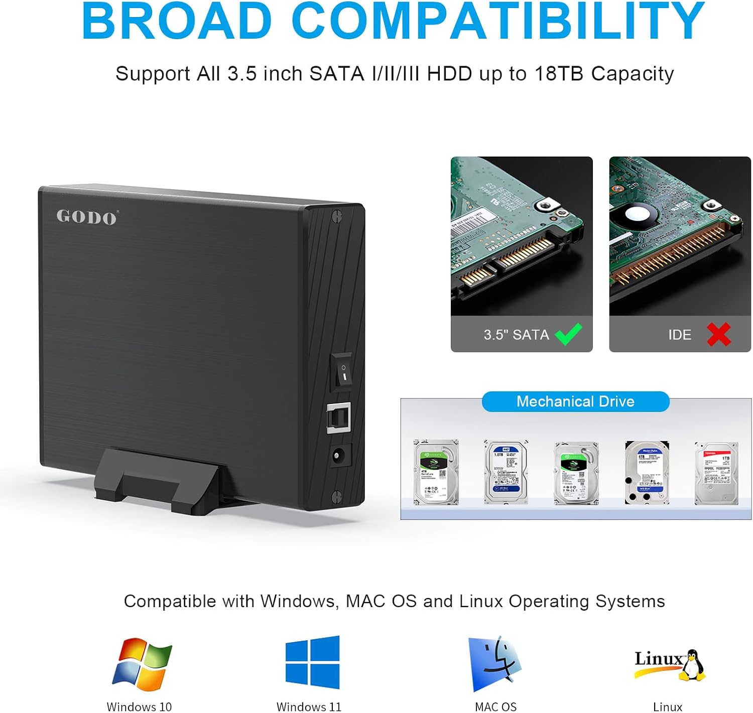 - 【Wide Compatibility】GODO external laptop hard drive enclosure supports all 3.5 inch SATA I/II/III /HDDs SSDs up to 18TB capacity. this 3.5 inch hard drive case is compatible with Windows XP/Vista/7/8/8. 1/10, Mac OS and Linux operating systems and on.