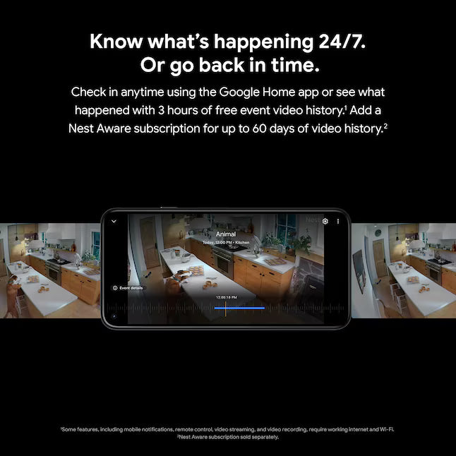Know what’s happening 24/7-Or go back in time.-Check in anytime or see what happened with 3 hours of free event video history-Add a Nest Aware subscription for up to 60 days of video history