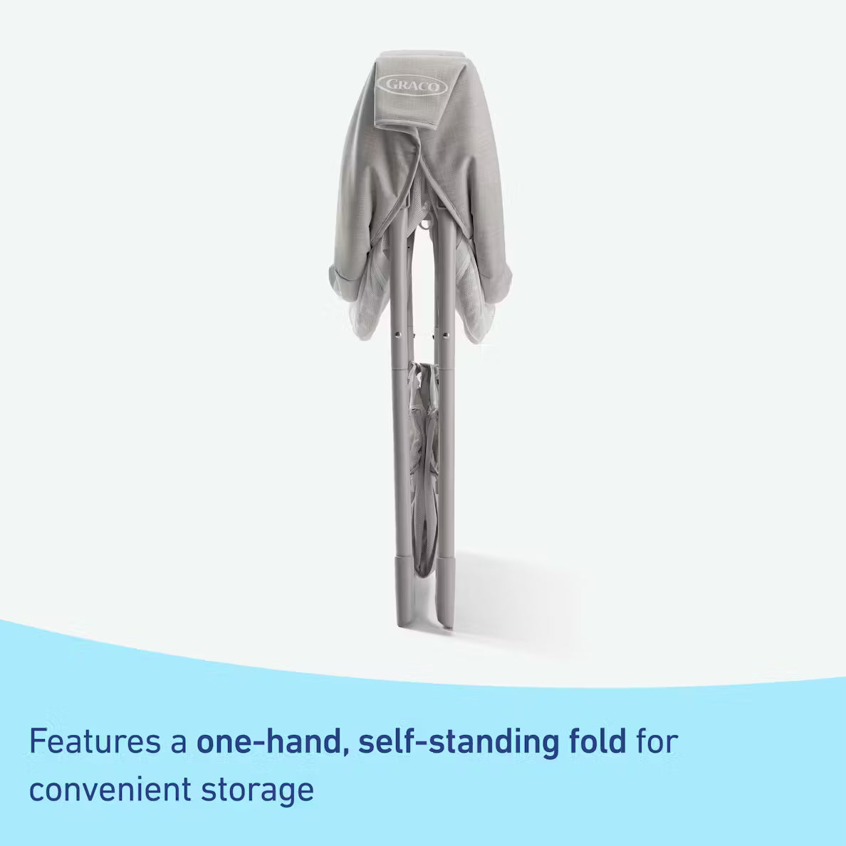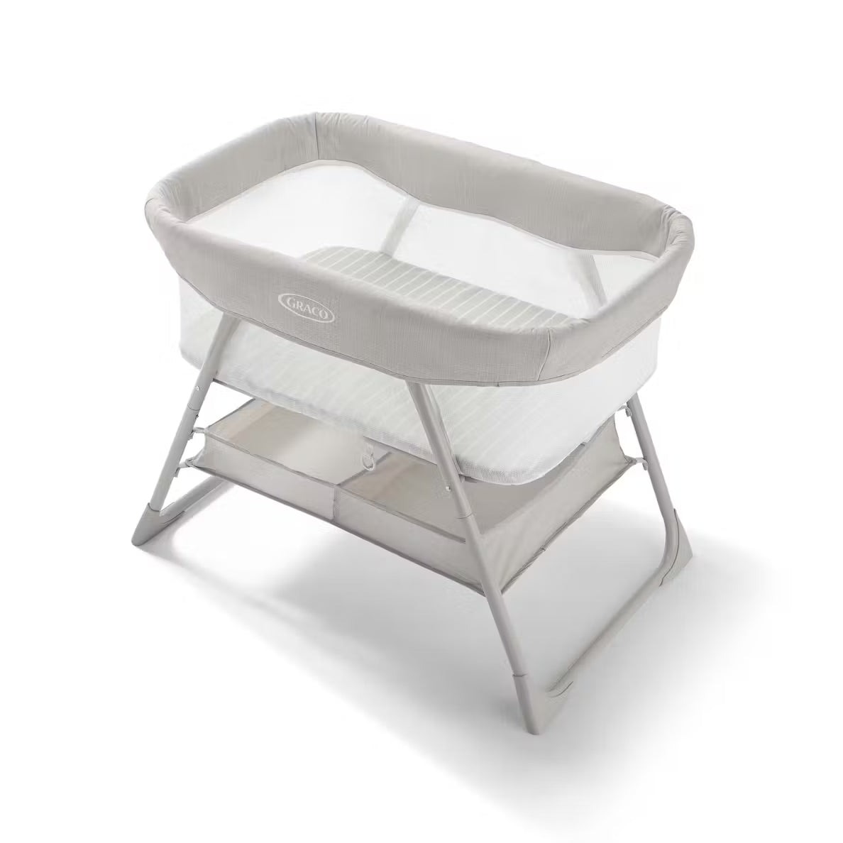 The Graco® DreamMore™ Bedside Bassinet is a perfect resting place for your little one while at home or away! The compact bedside bassinet is designed with a spacious sleeping area and a firm, flat surface to help create a safe sleep space for your newborn. Featuring a one-hand self-standing fold for easy storage, the bassinet conveniently and compactly folds to fit in the included travel carry bag so you can take on trips near or far, providing the comfort of a familiar sleep spot for both nighttime and naps. Airy mesh sides provide both breathability for baby's comfort and visibility for parents to discreetly check in. An included machine-washable bassinet sheet helps keep baby's sleep space clean. The large storage organizer with divider helps keep essentials close at hand.